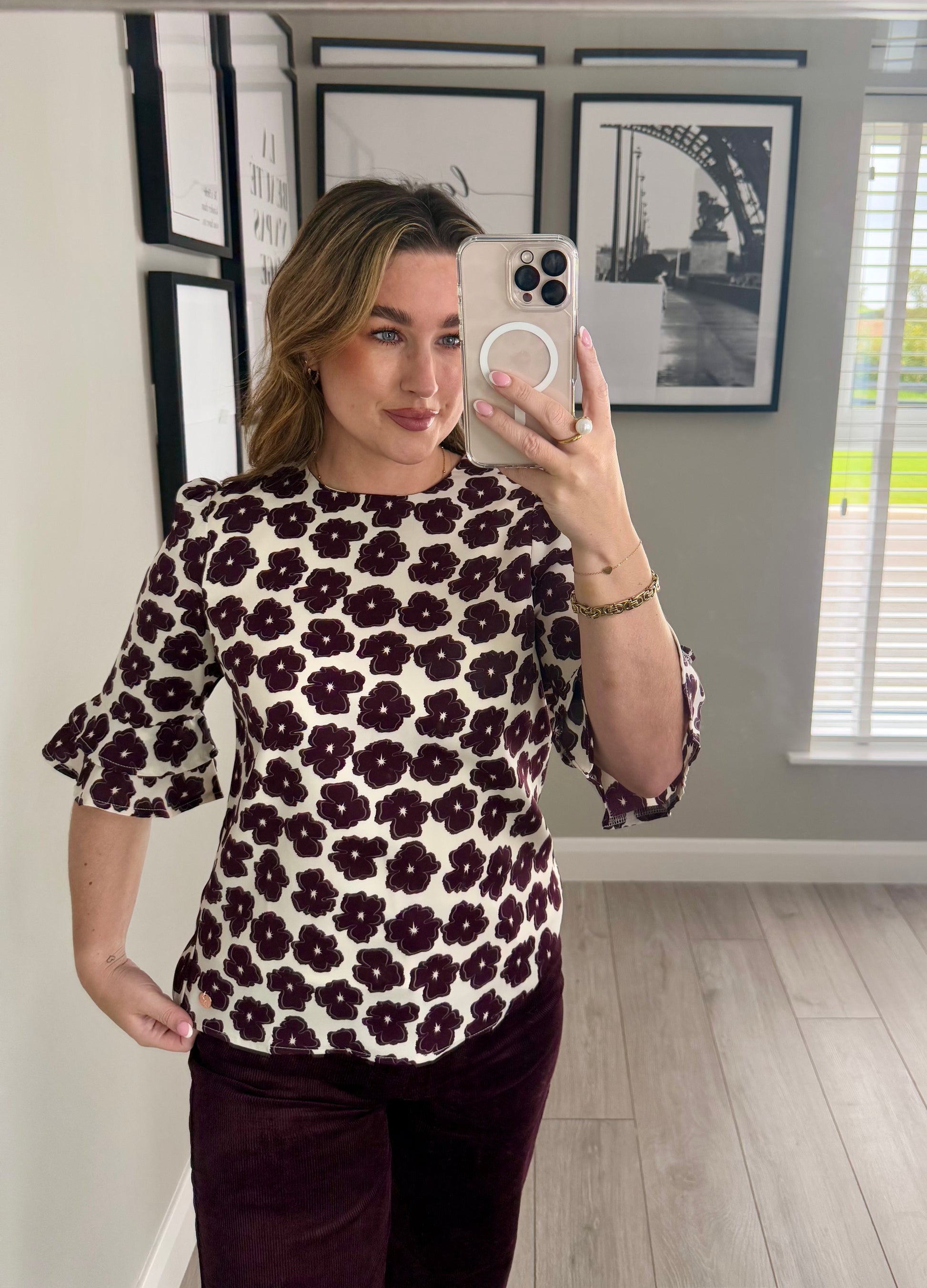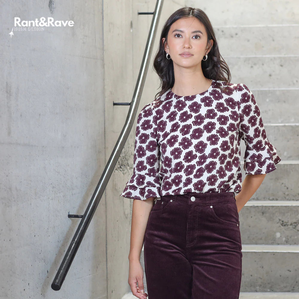 -Rant & Rave silk effect two tone top. Bold floral plum print on a soft ivory base with half subtlety flared sleeves & round neckline.