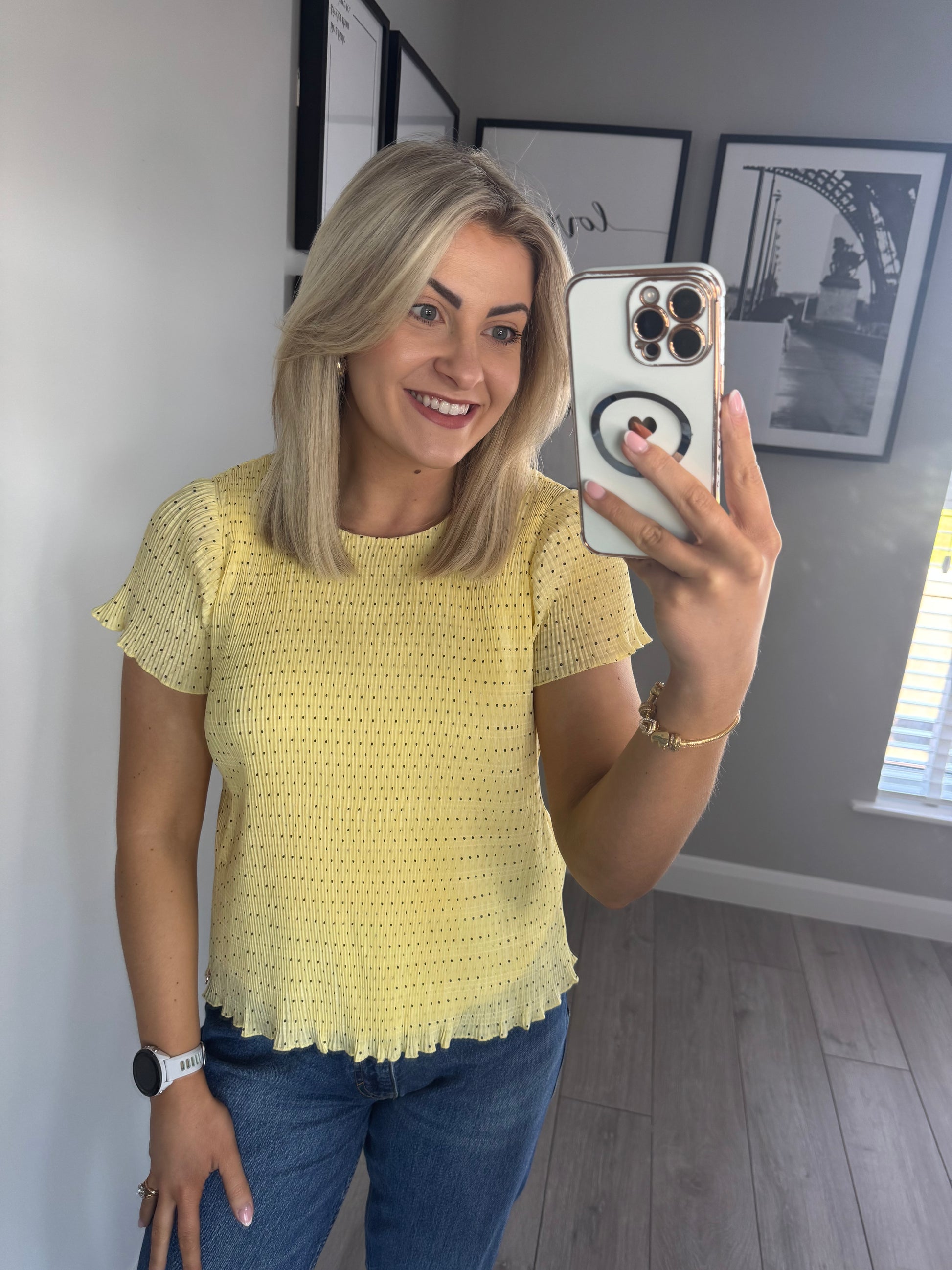 -Rant & Rave yellow crinkle effect top with fine black spot. Short sleeves & button fastening to the back of neck.