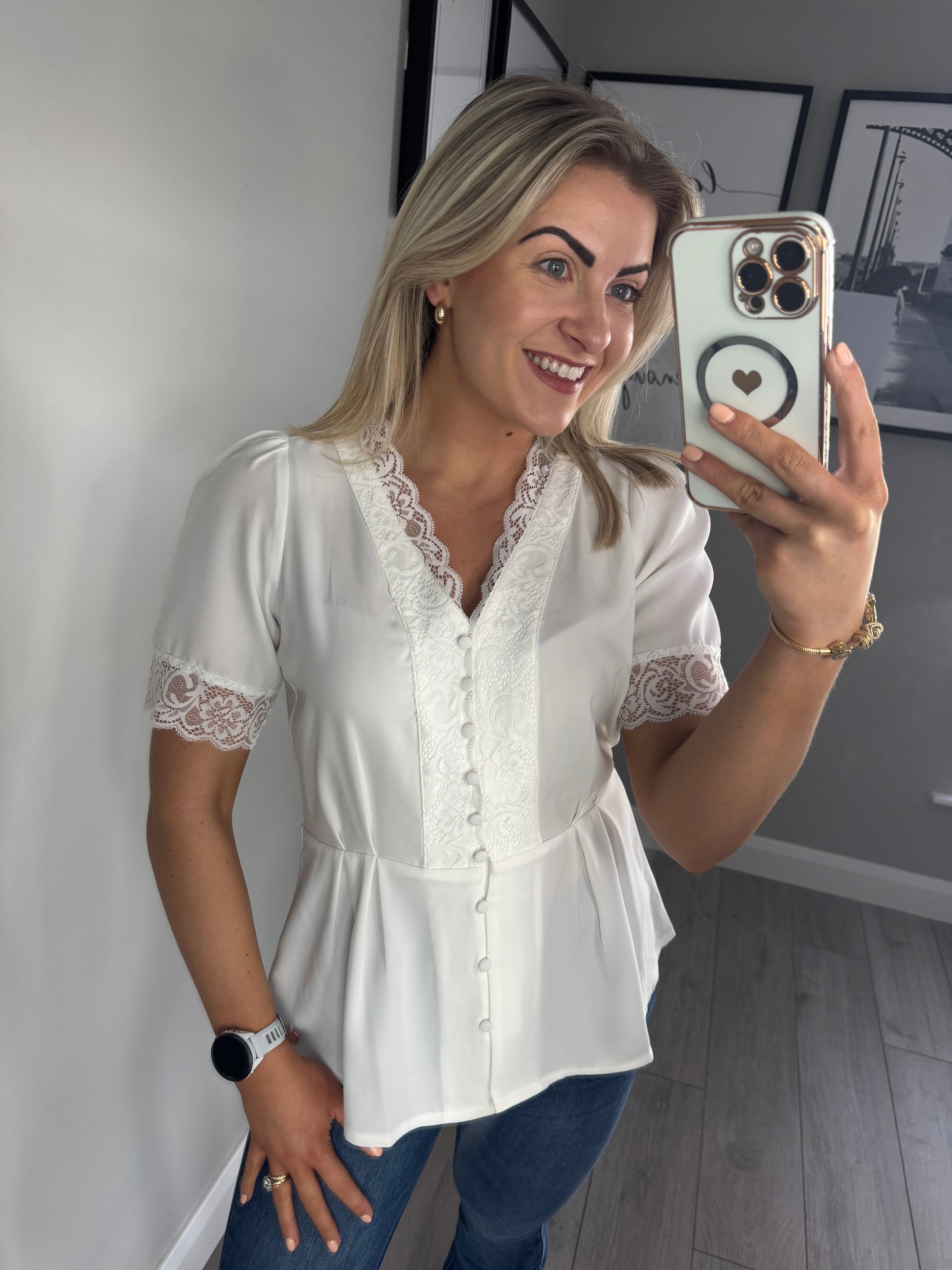 -Rant & Rave white trim lace blouse with peplum style hem.