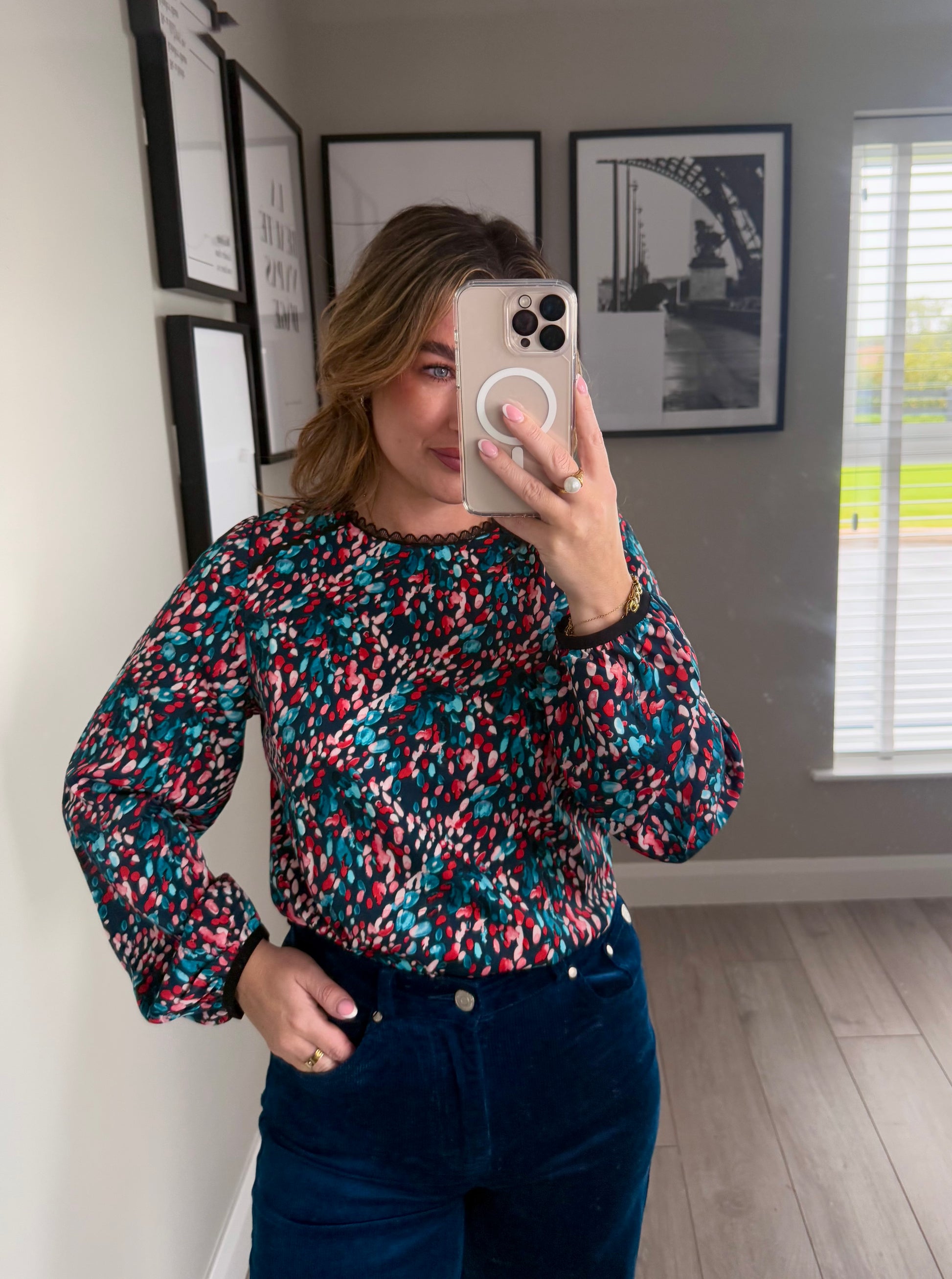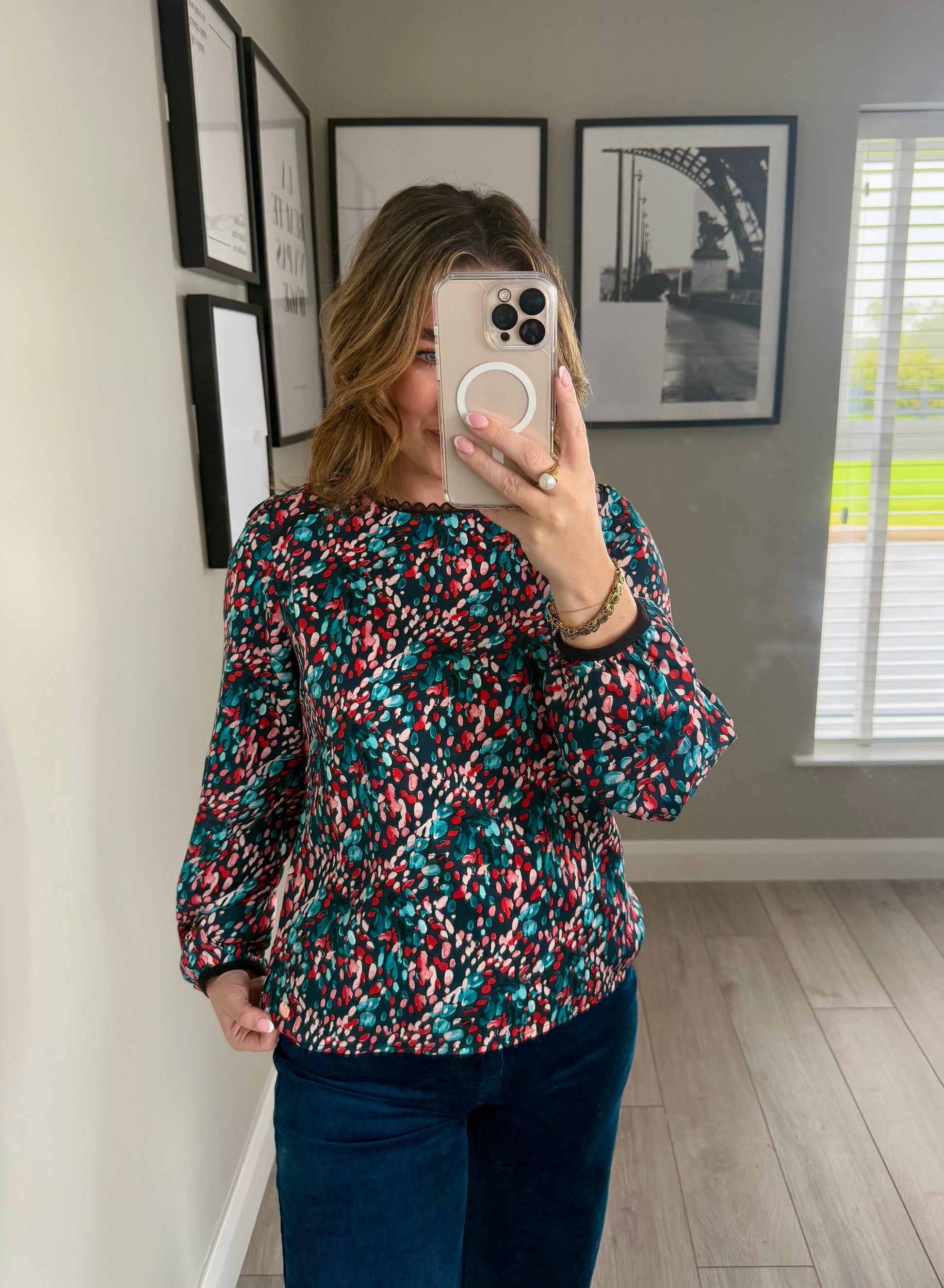 -Rant & Rave two toned green & teal blouse. Abstract print with scalloped round neck collar & full length sleeves.