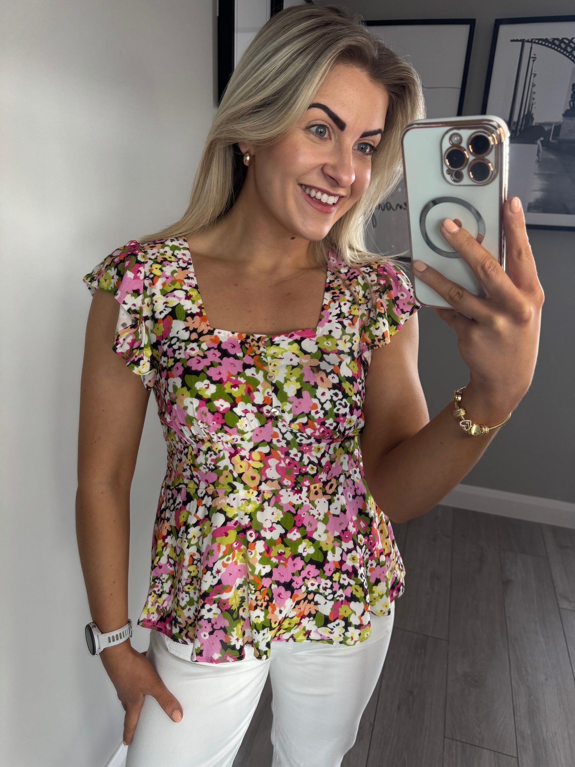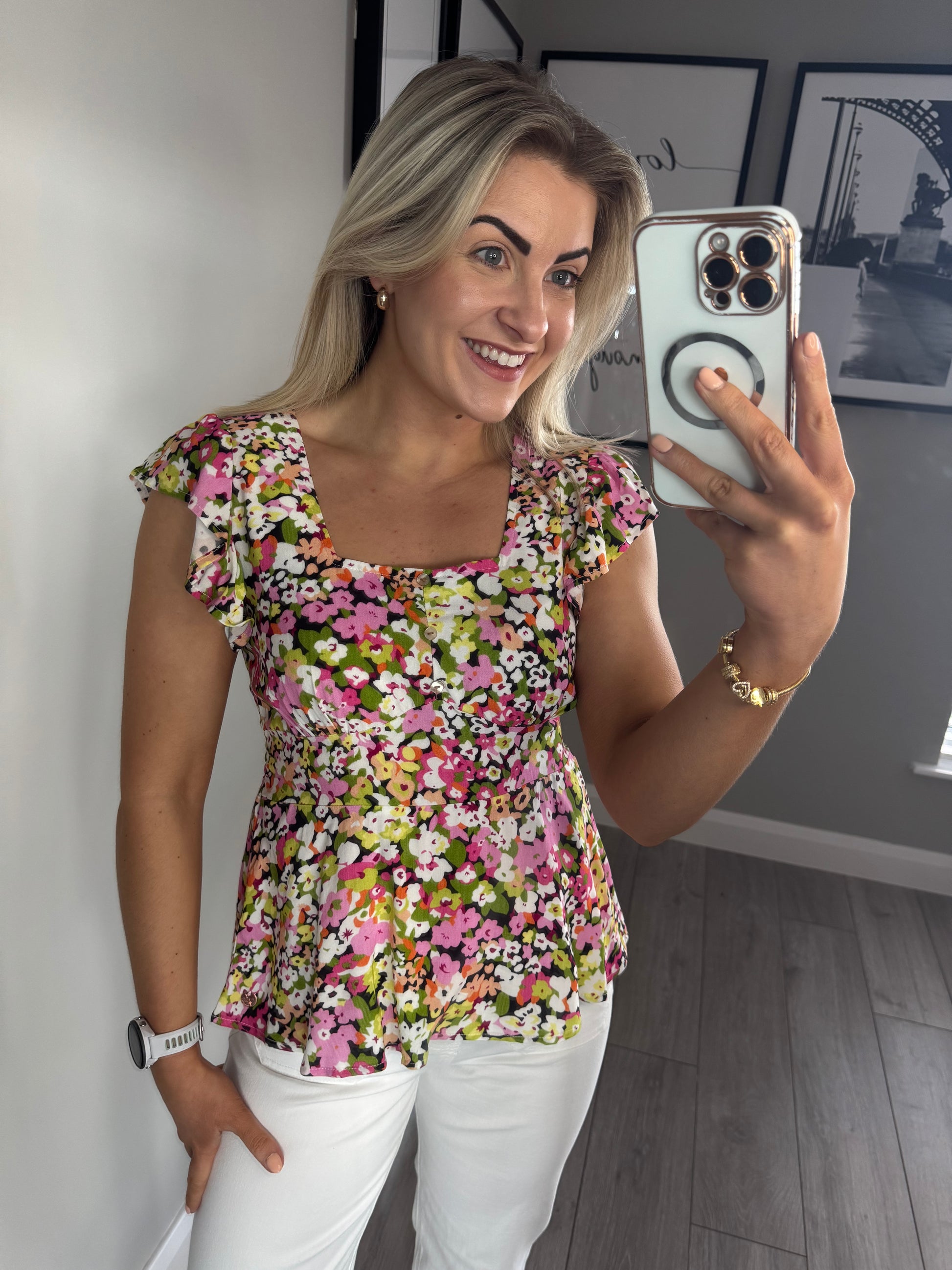 -Rant & Rave green & pink multi coloured floral top with square neckline, floating cap sleeves, peplum bottom & shell effect button details.