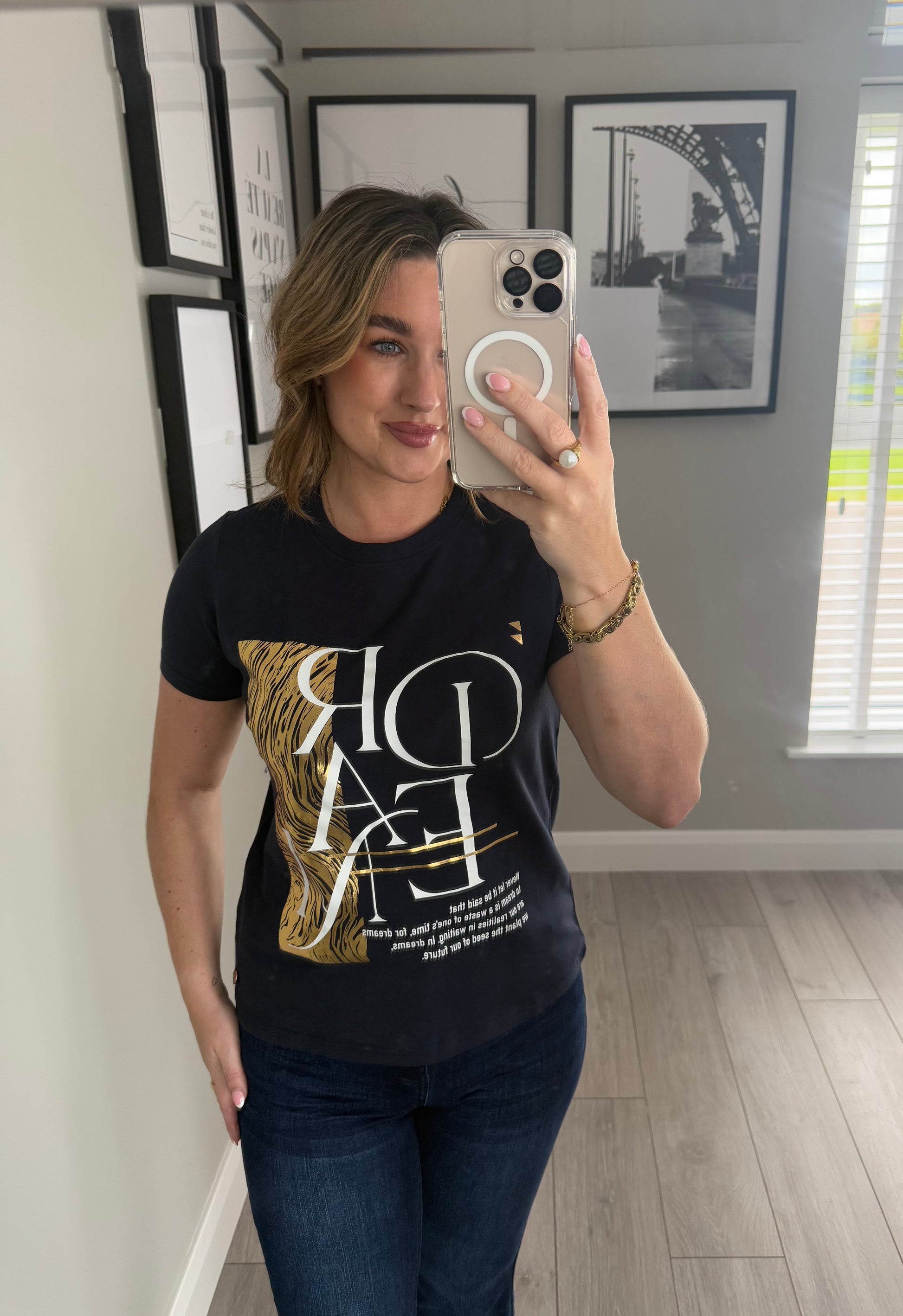 -Rant & Rave short sleeved navy tee with metallic gold & white motif slogan to the centre.