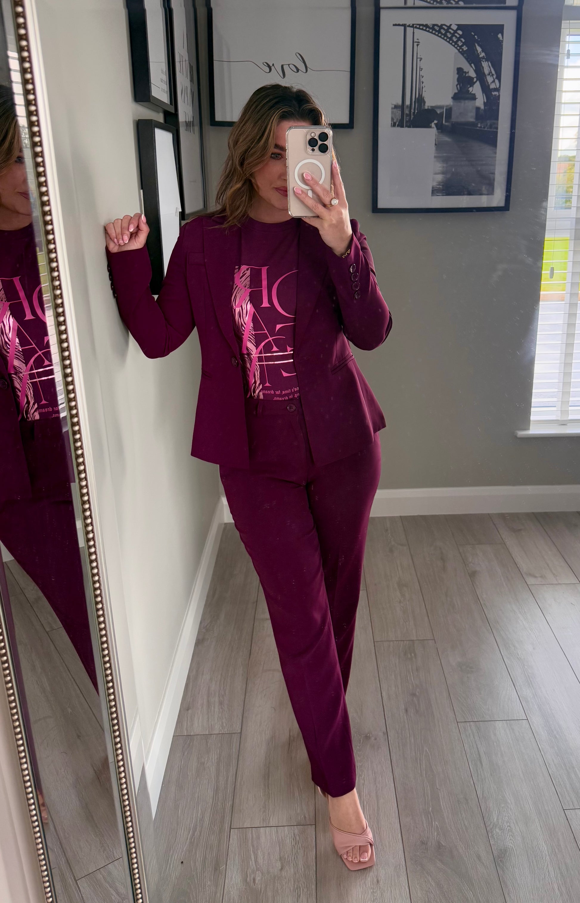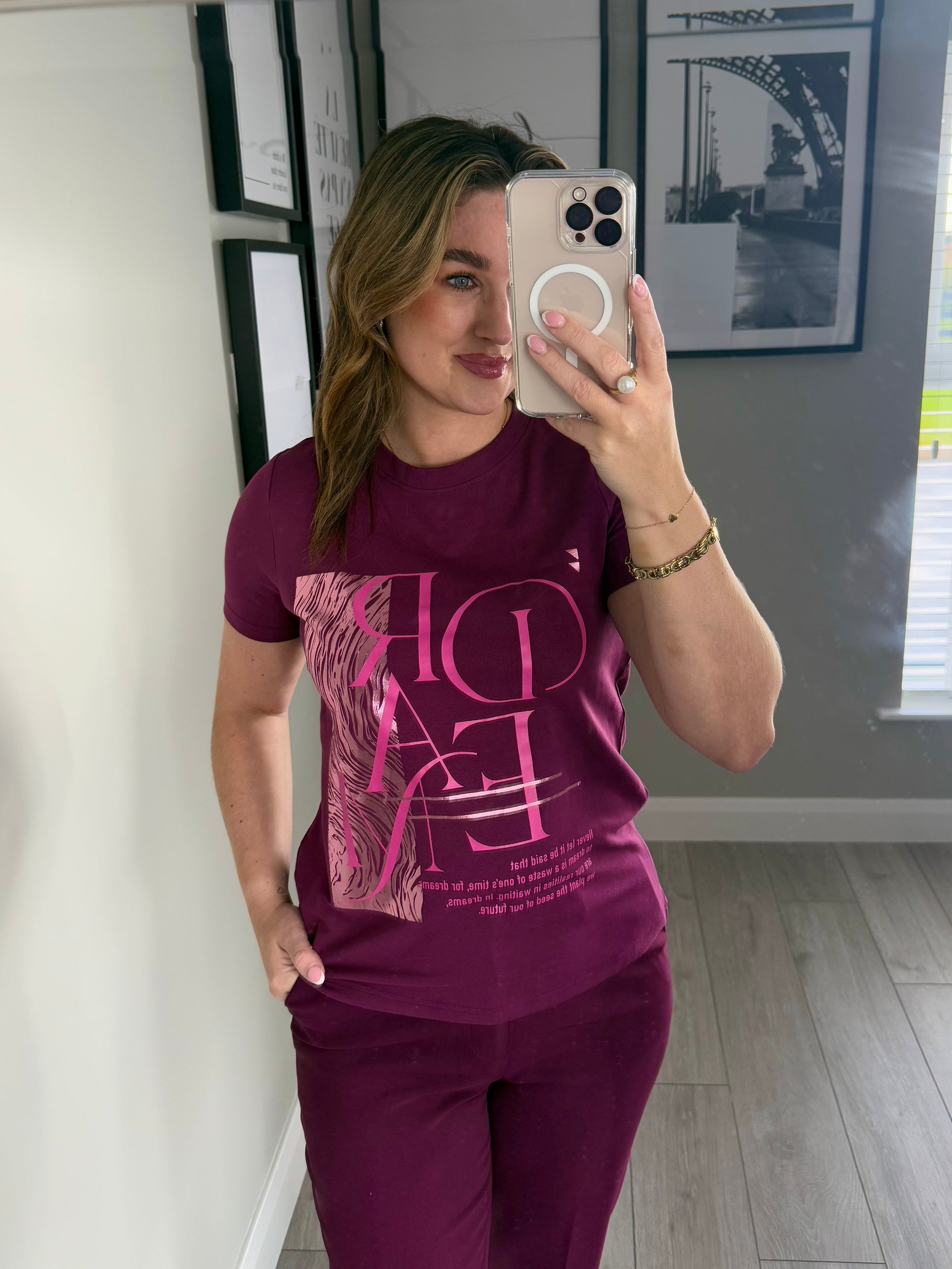 -Rant & Rave short sleeved plum tee with metallic pink motif slogan to the centre.