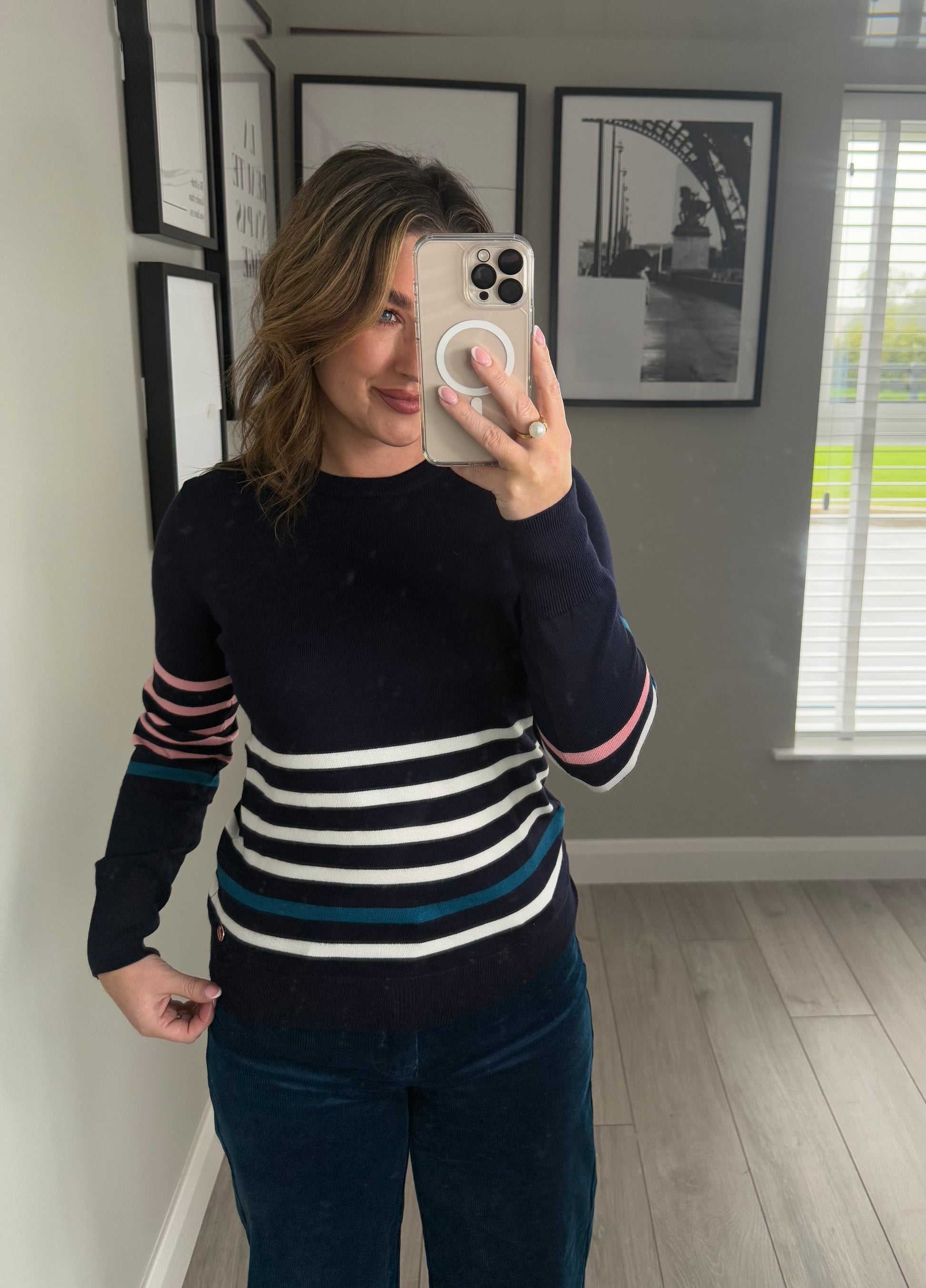 -Rant & Rave fine knit jumper with multi (teal, white & blush) stripe detail. Round neck & long cuffed sleeves.