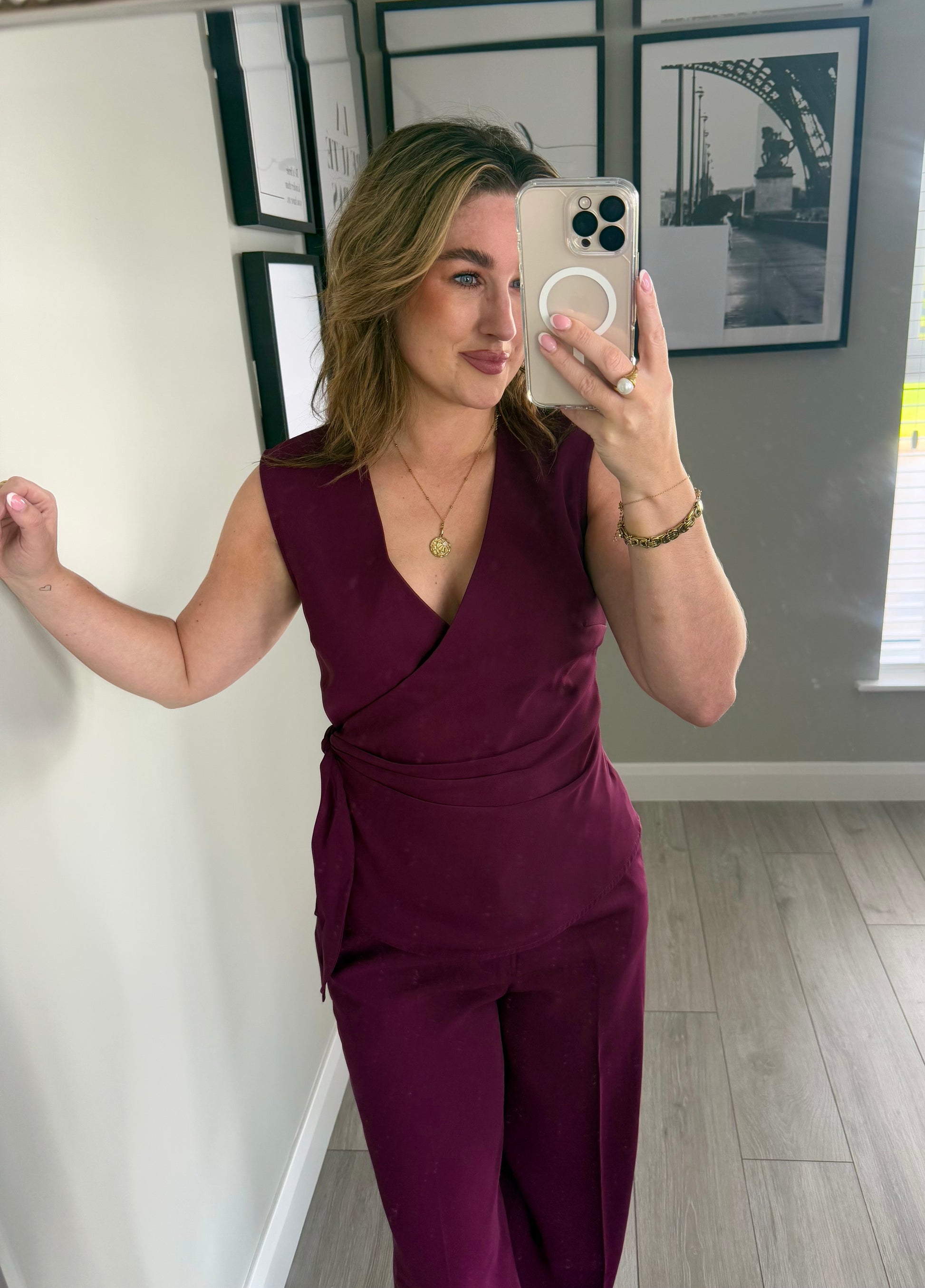 -Rant & Rave stunning cranberry waistcoat. In wrap style with side tying & sleeveless design it's very flattering to be wore on its own or layered.