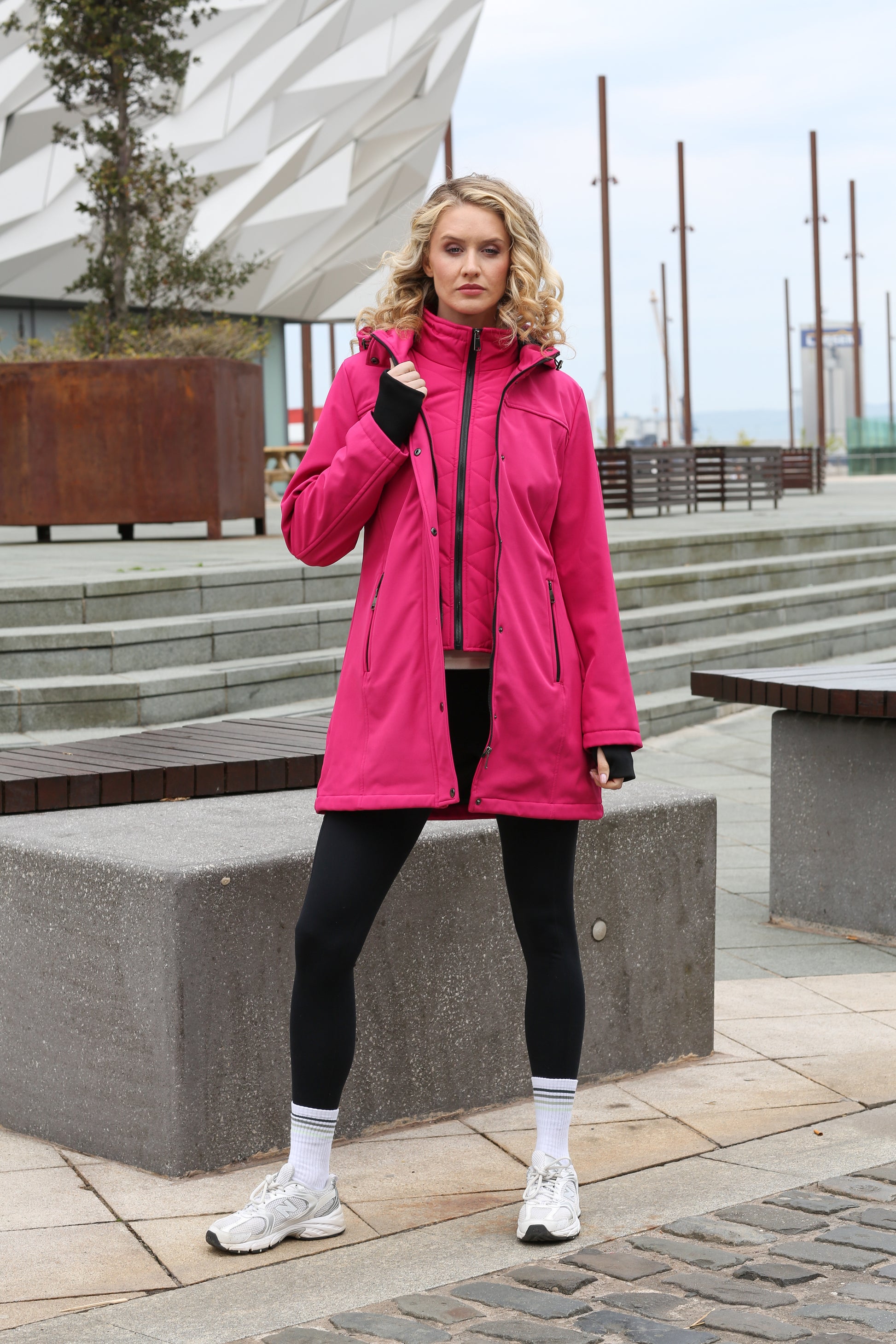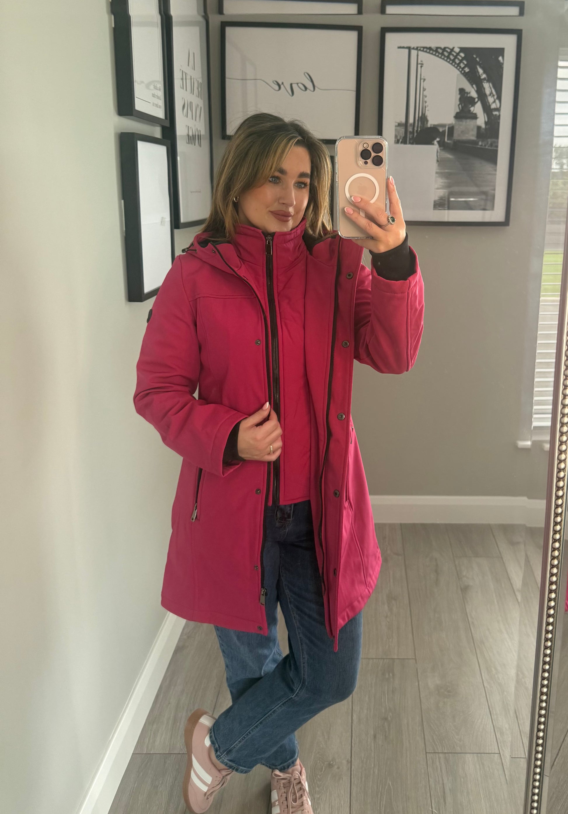 -Relax & Renew soft shell water repellent coat in cerise pink. Fully lined with short padded jacket effect to the bodice & cuff sleeves. Finished with generous hood.