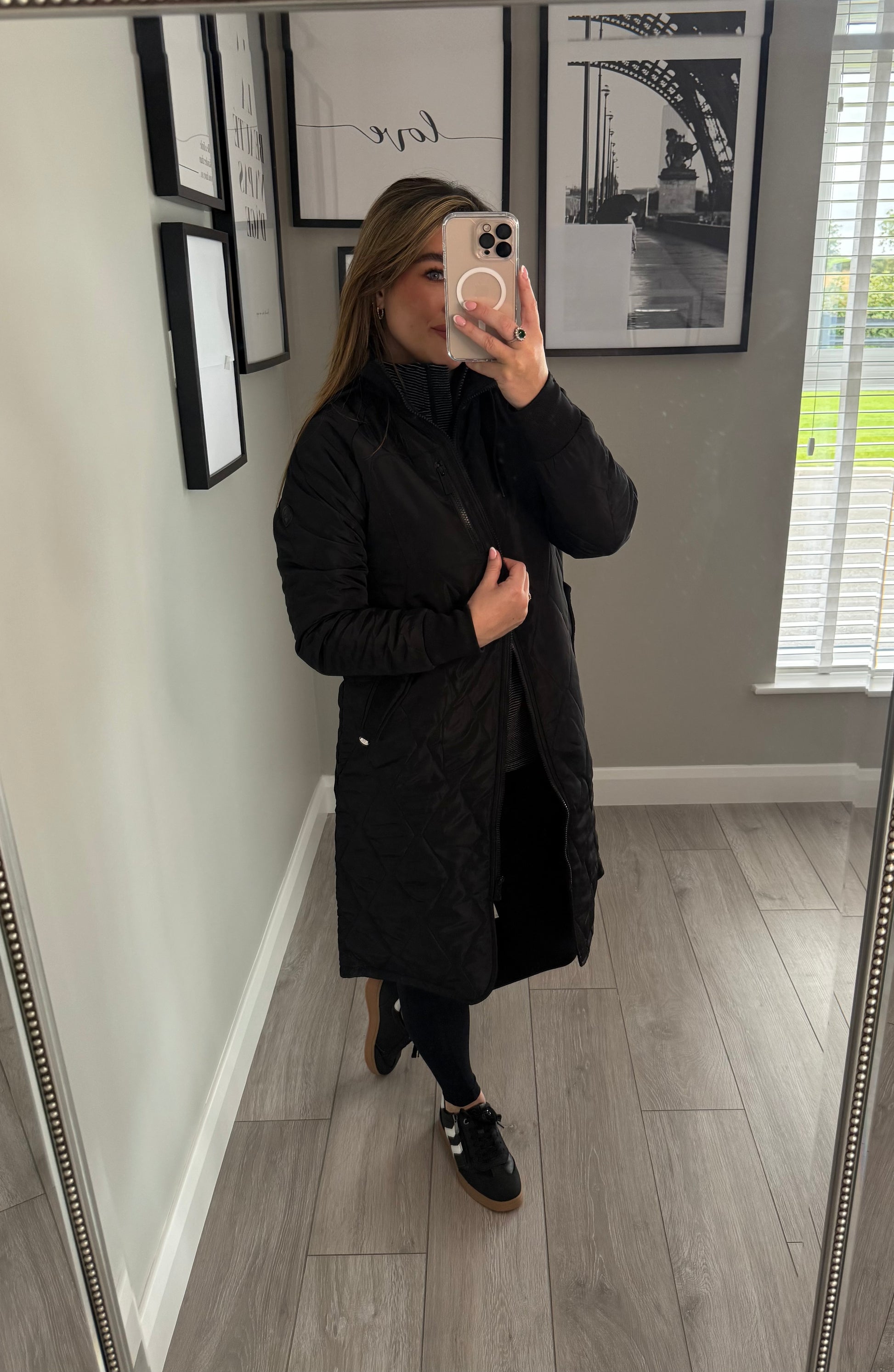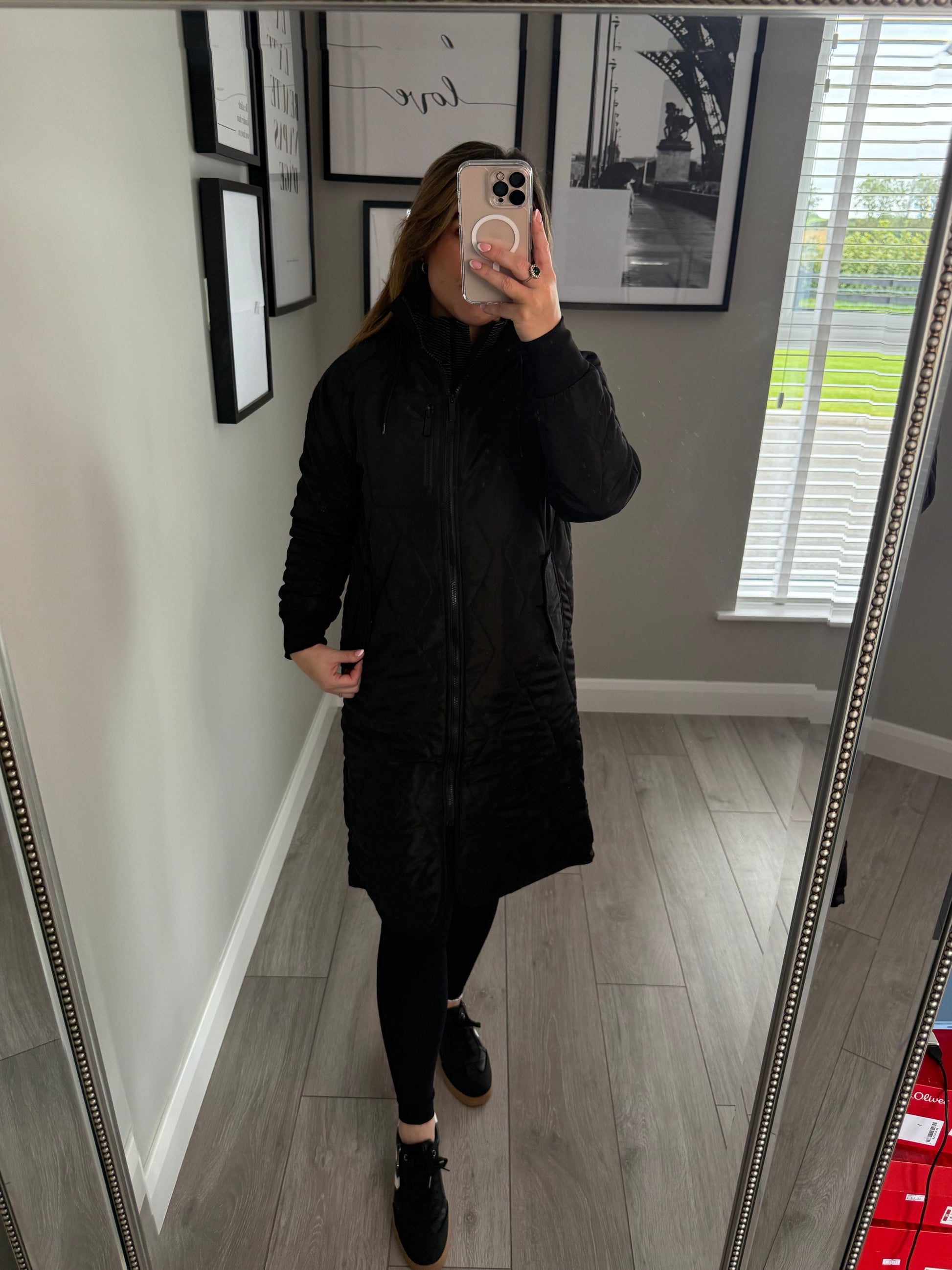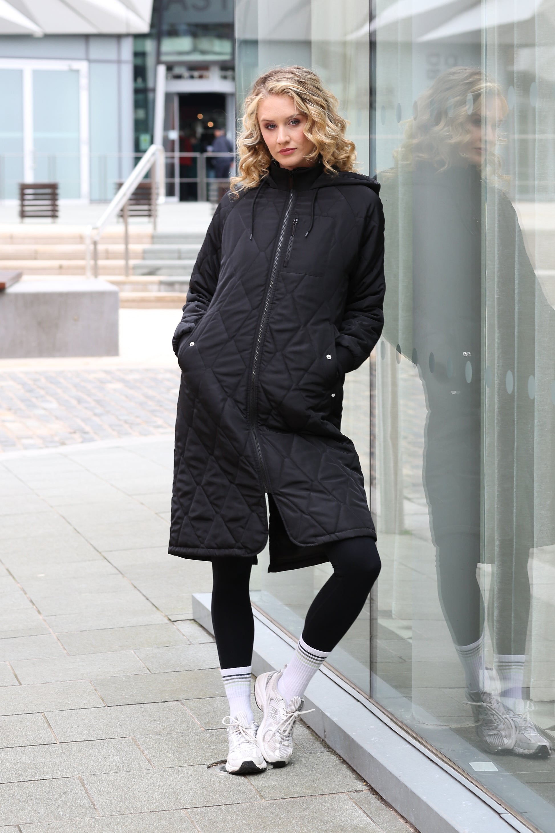 -Relax & Renew lightly padded longline coat in black. Double closure pockets with zip through & generous hood. Finished with dipped hem.