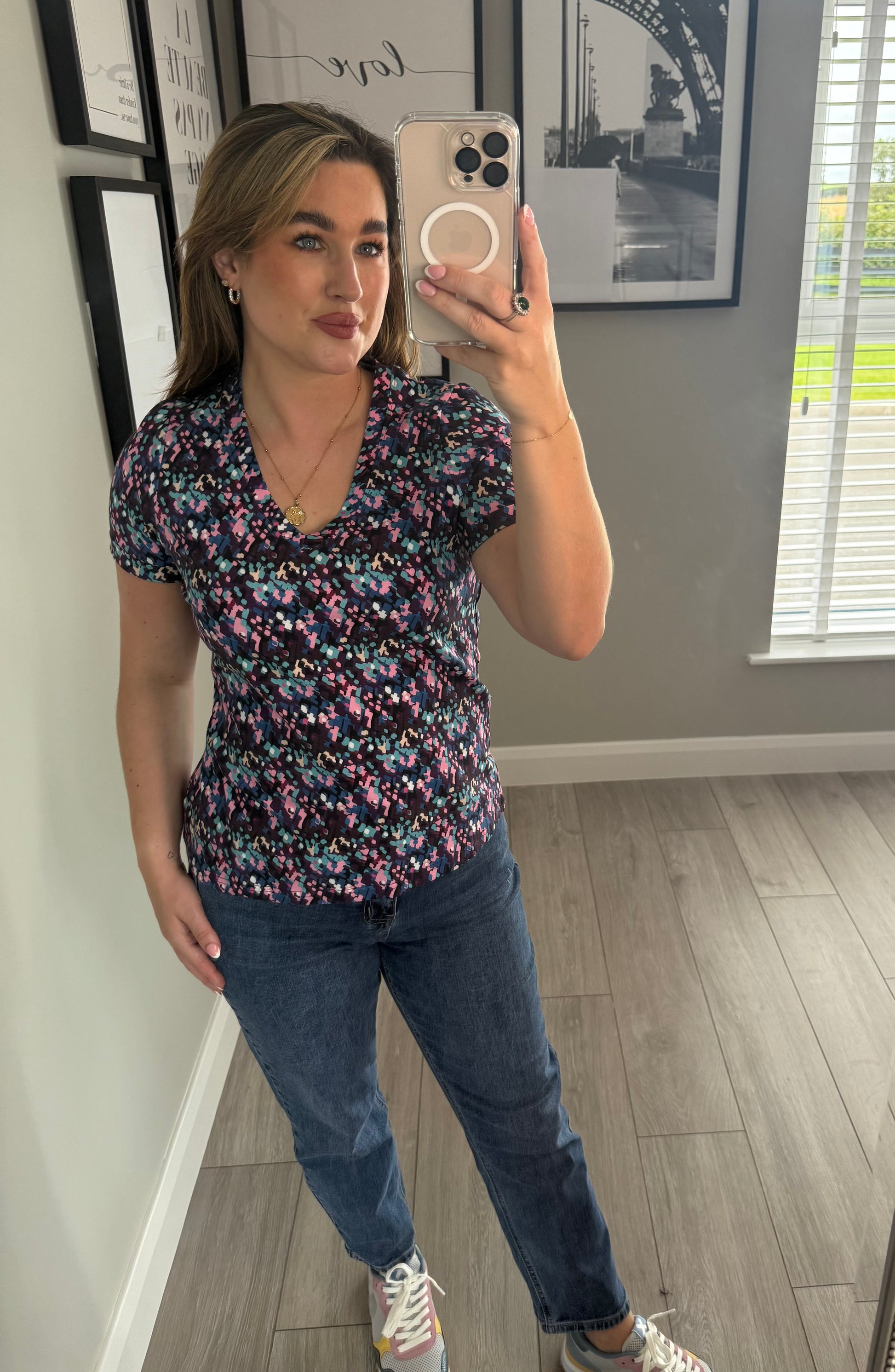 -Relax & Renew short sleeve tee in multi coloured aztec print. V neckline.