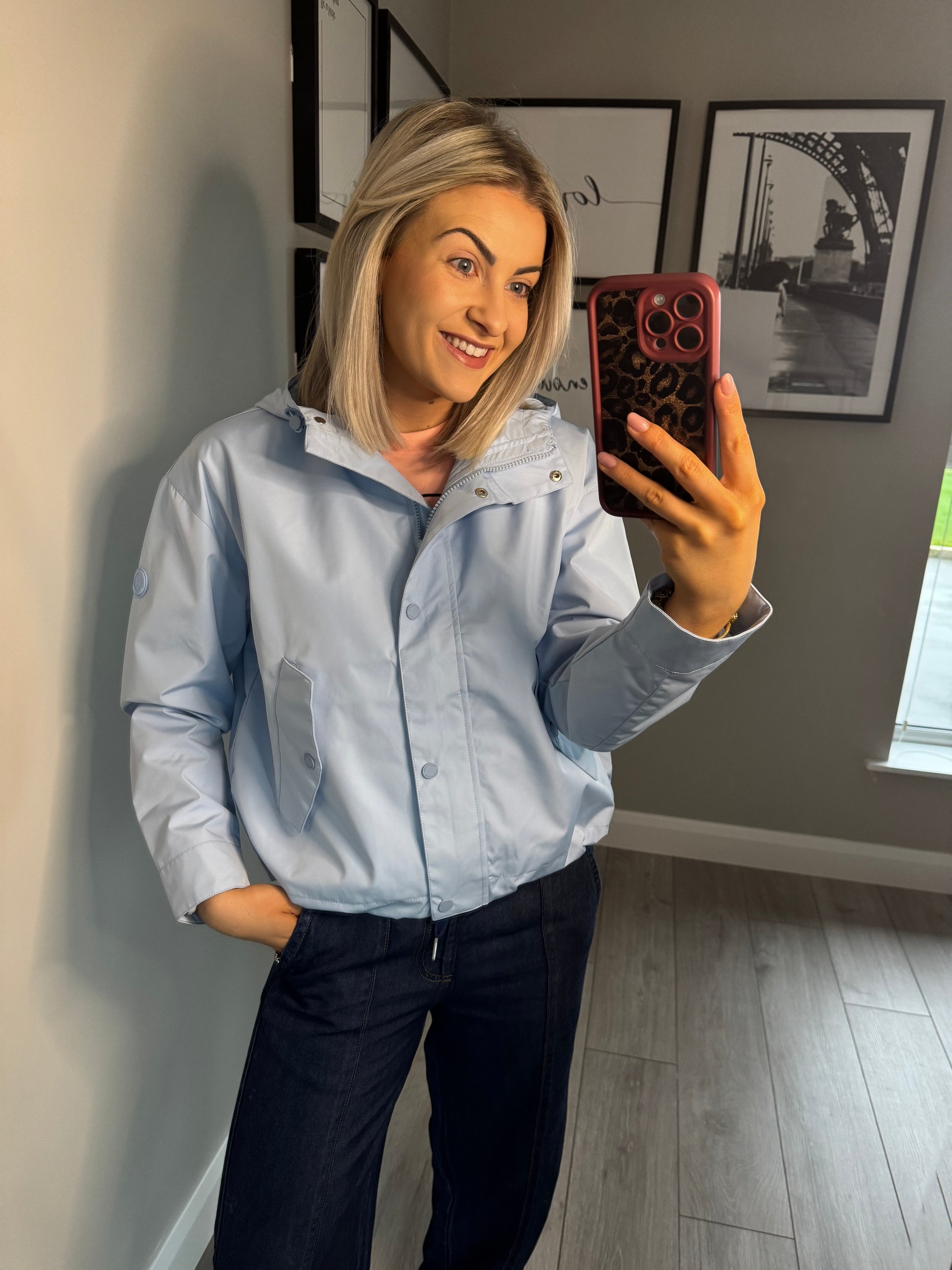 -Relax & Renew lightweight water repellent coat in soft blue. Designed for pulling on for those transitional seasons it's got a generous hood, button & zip through fastening & side pockets. Optional drawstring to the hem.