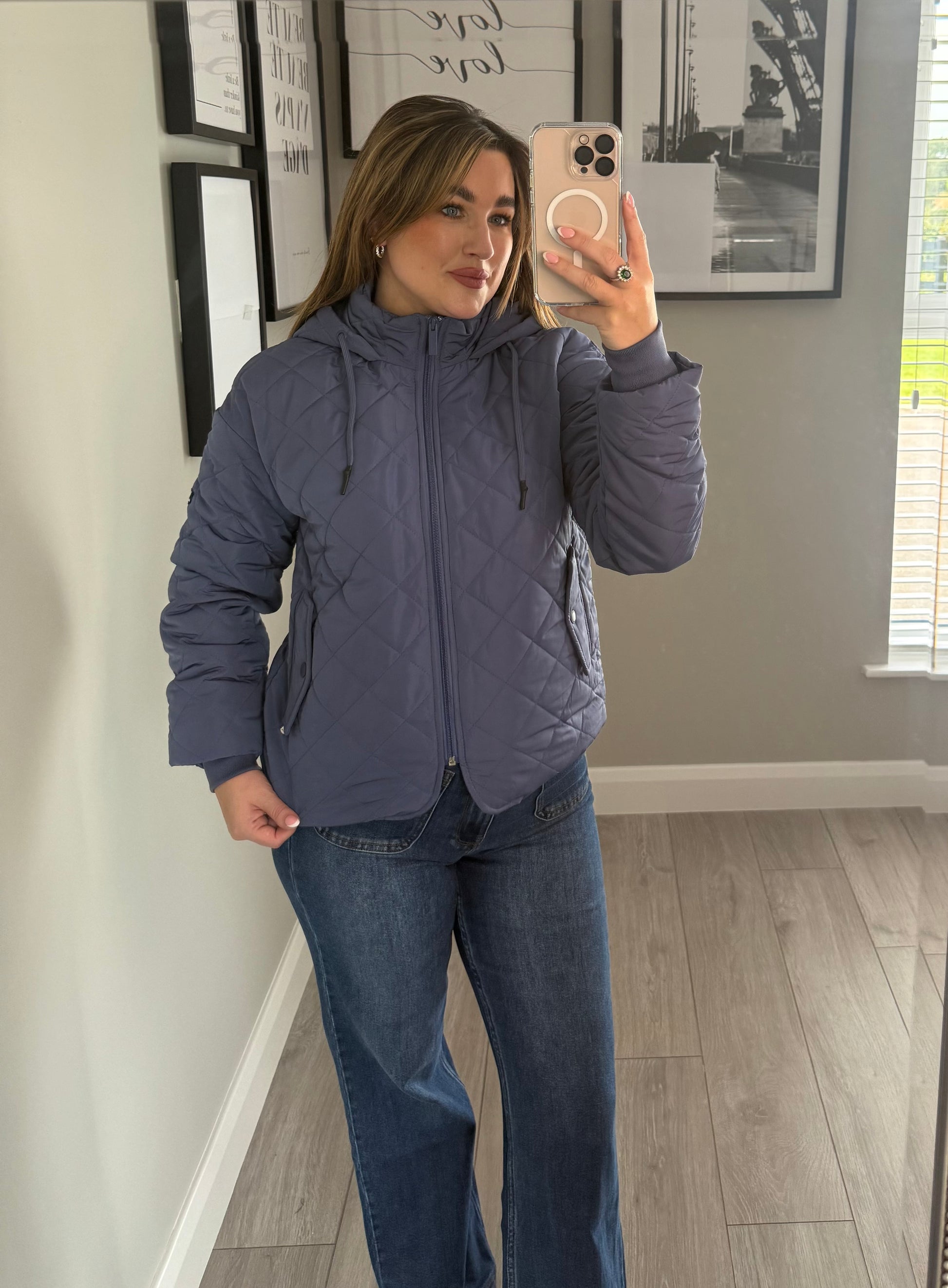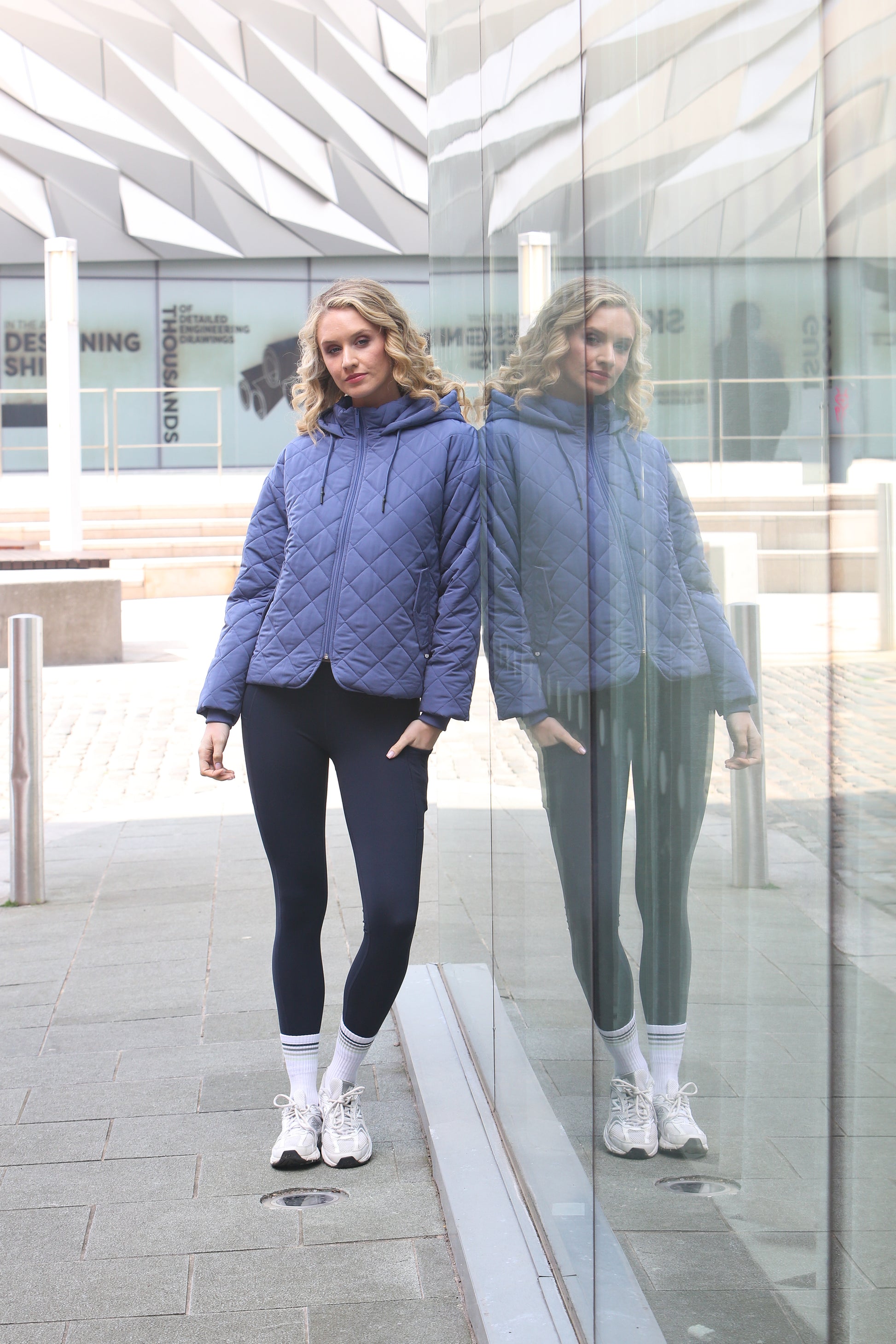 -Relax & Renew lightly padded jacket in ink blue. Double closure pockets with zip through & generous hood.