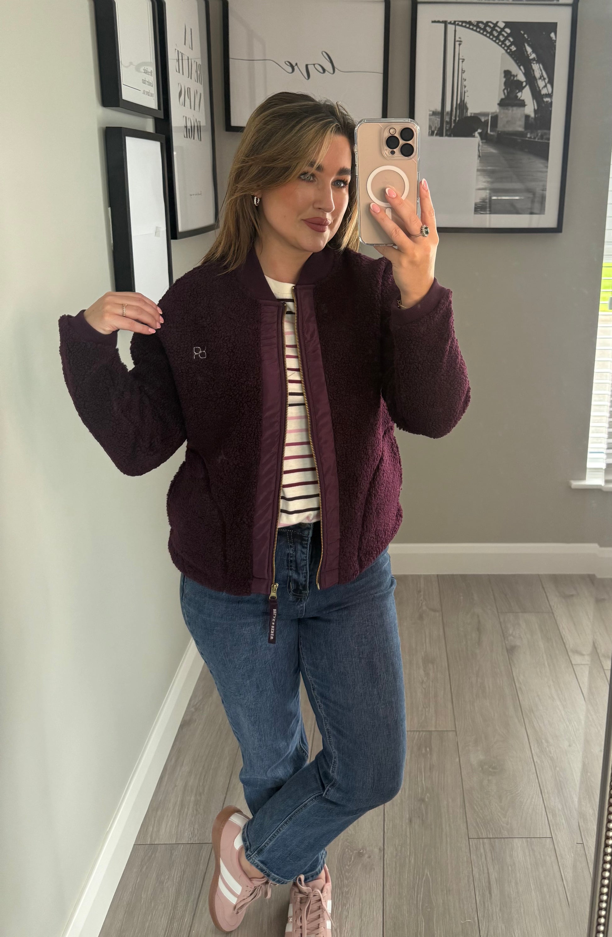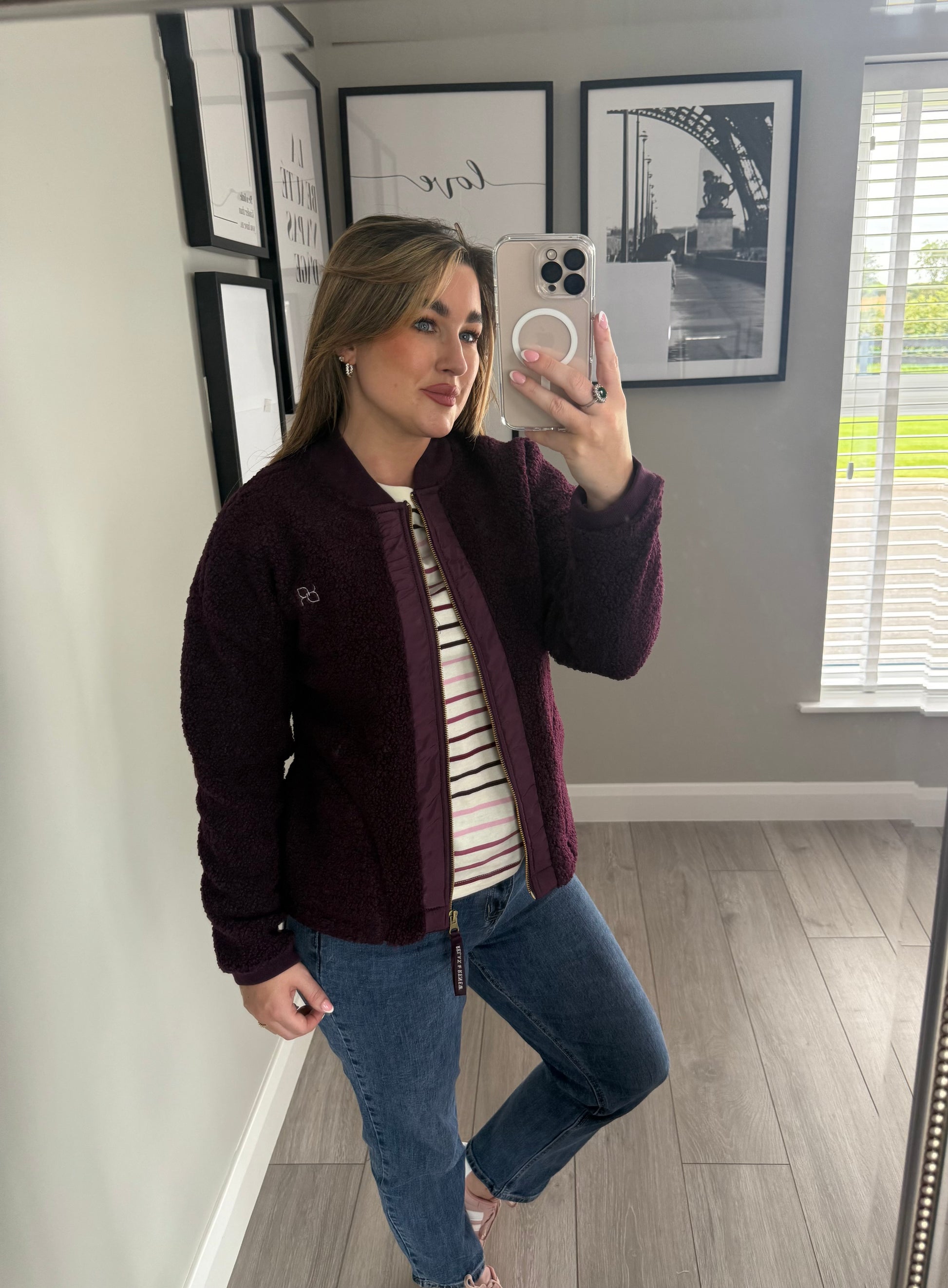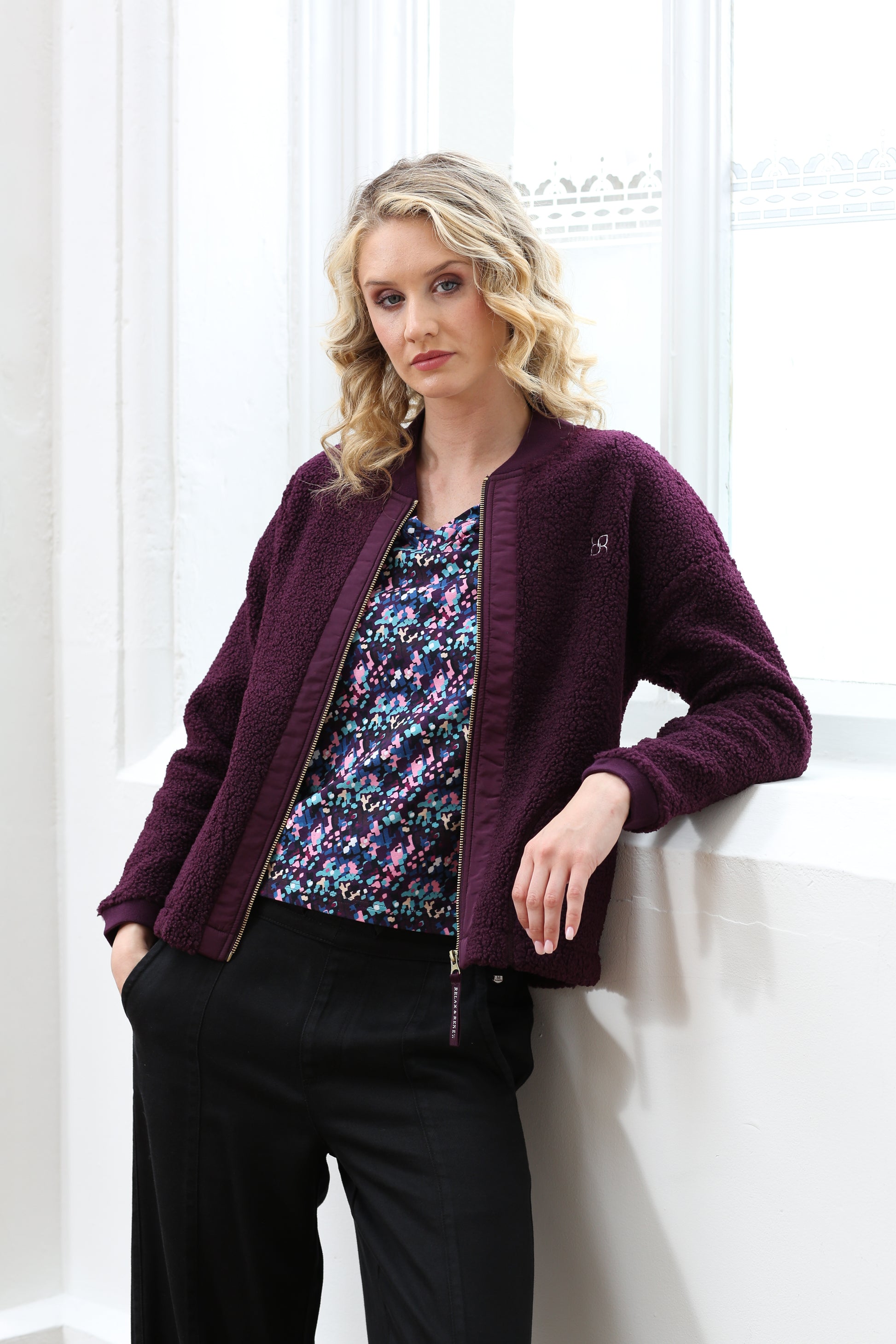 -Relax & Renew soft borg bomber jacket in plum. Double pockets finished with ribbed neckline & cuffs. Subtle branding to the left breast & zip.