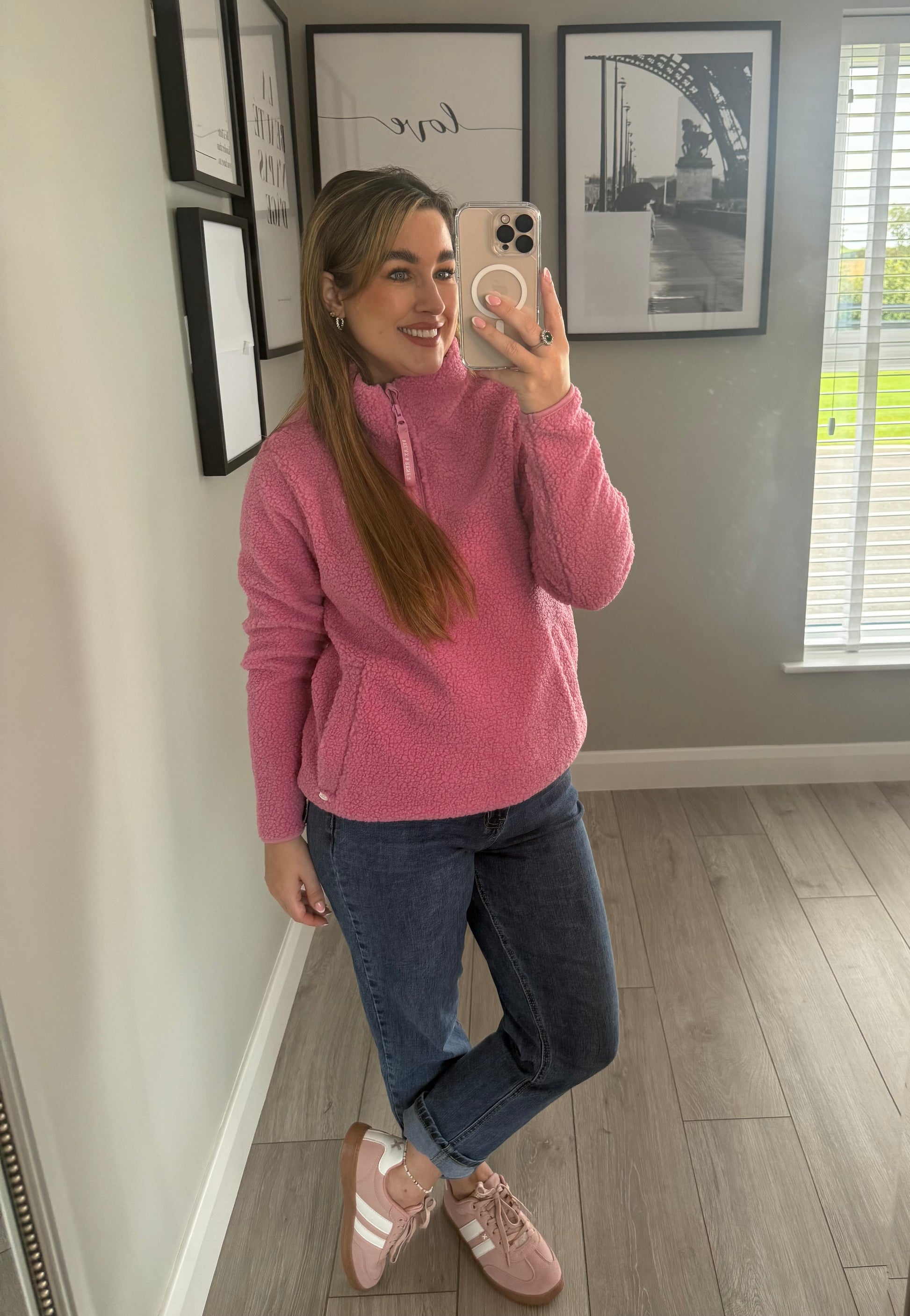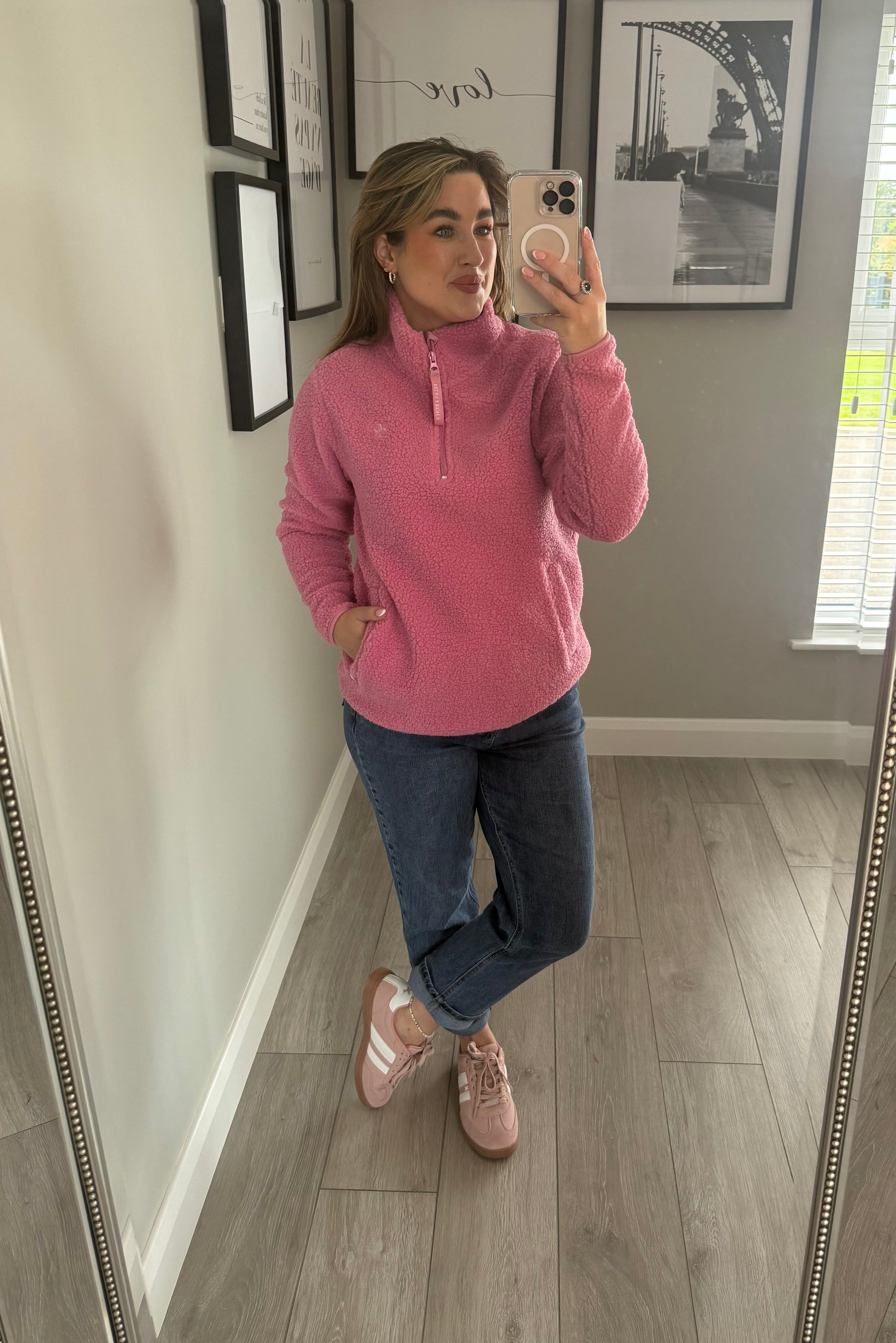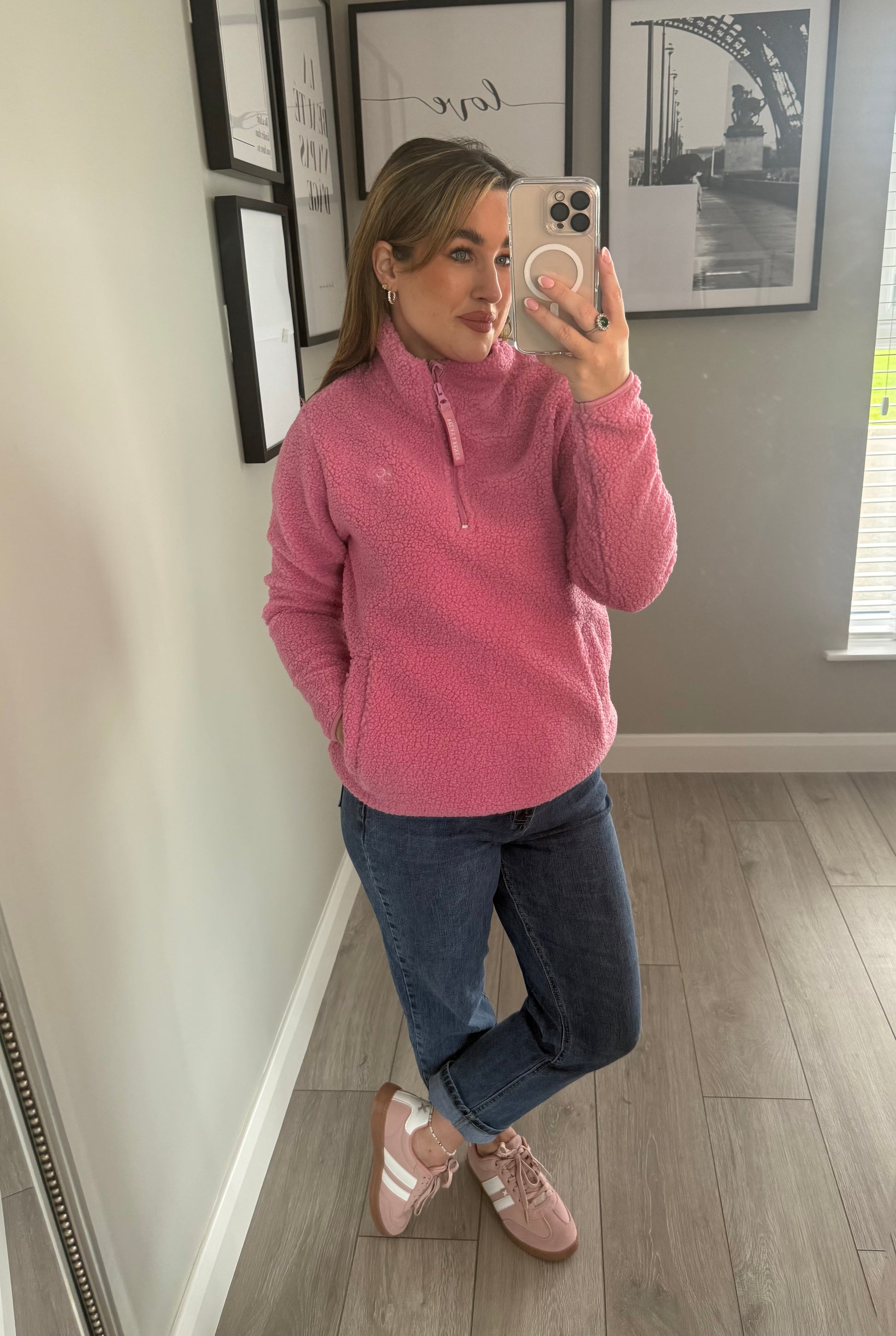-Relax & Renew half zip borg fleece in pink. Large kangaroo pocket with dipped hemline to the front & back. Subtle branding to the left breast & zip.