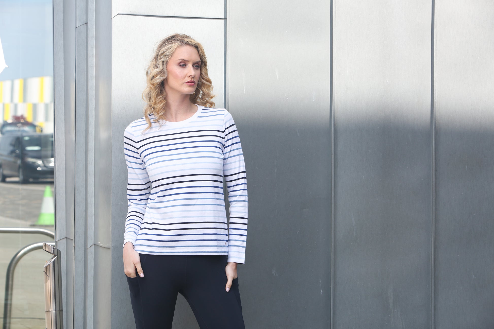 -Relax & Renew long sleeve tee in multi coloured stripe design (blue). Round neckline & branding to the hemline.