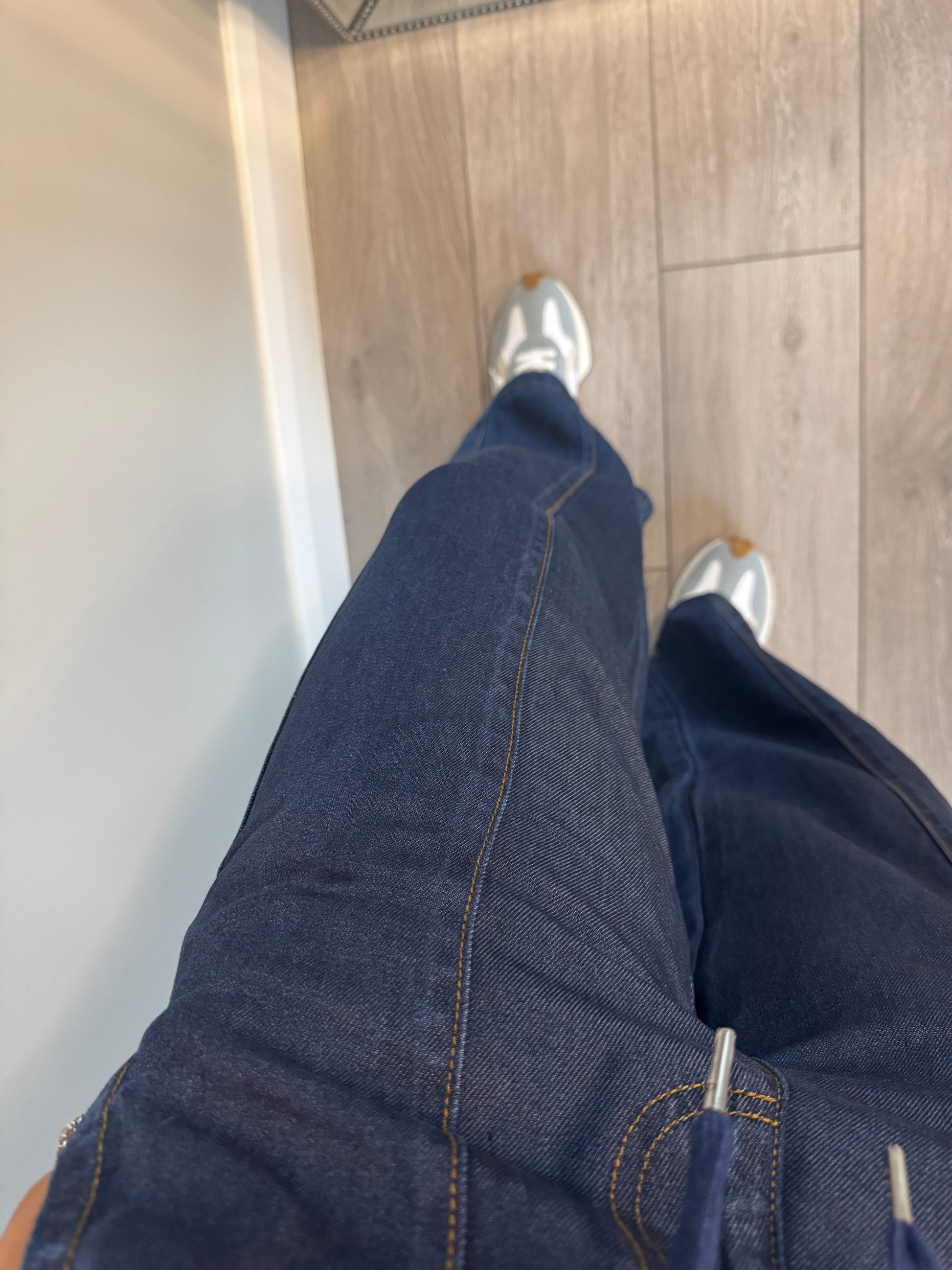 -Relax & Renew dark wash denim elasticated trouser (a comfy jean!). With wide leg design, elasticated drawstring waistband & double pockets they are the perfect smart casual base!