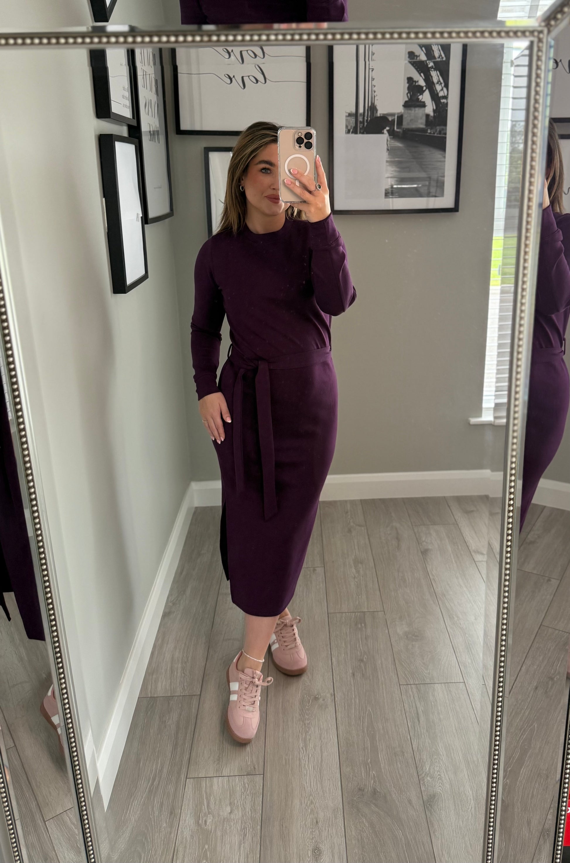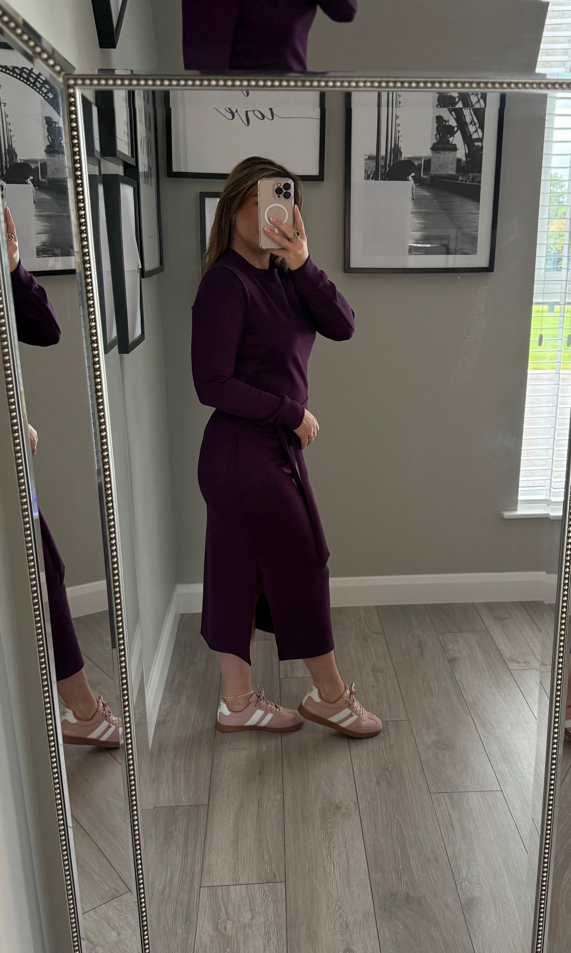 -Relax & Renew soft finish jersey dress in plum. Full length sleeves, midi length with added matching belt to the waistline.