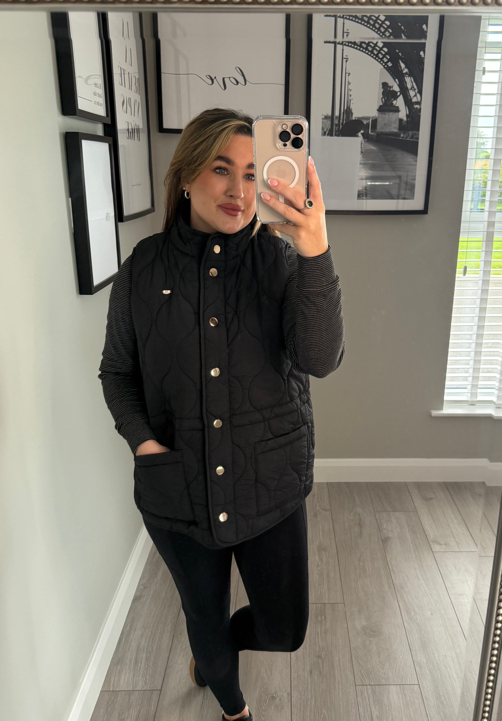 -Relax & Renew short gilet in black. Button through on gold hardware with waist adjustment & double front pockets.