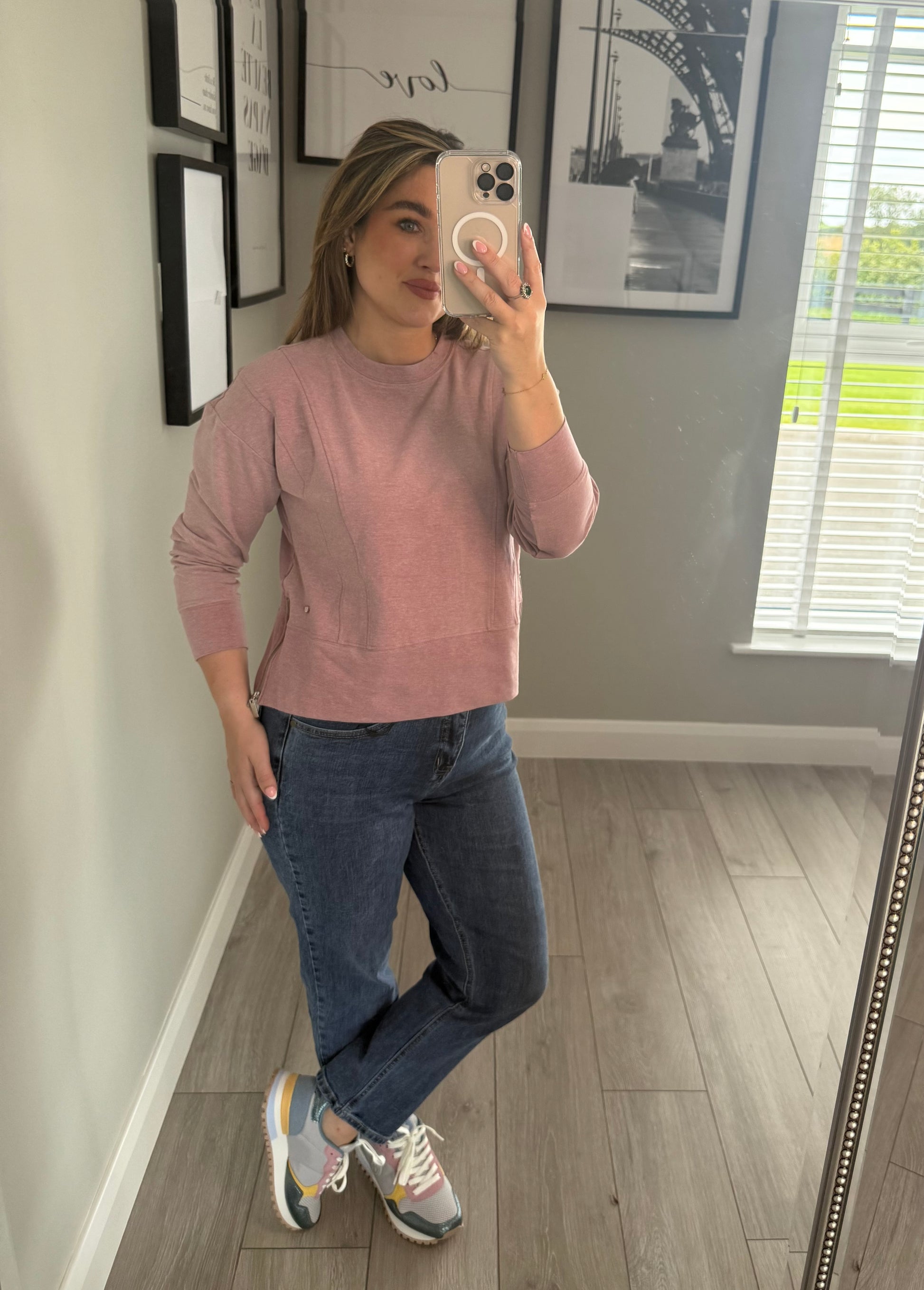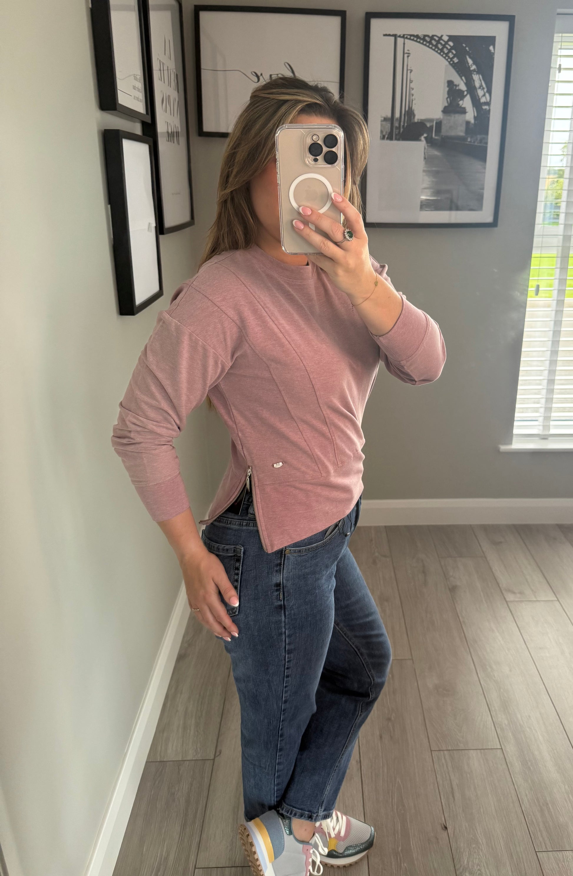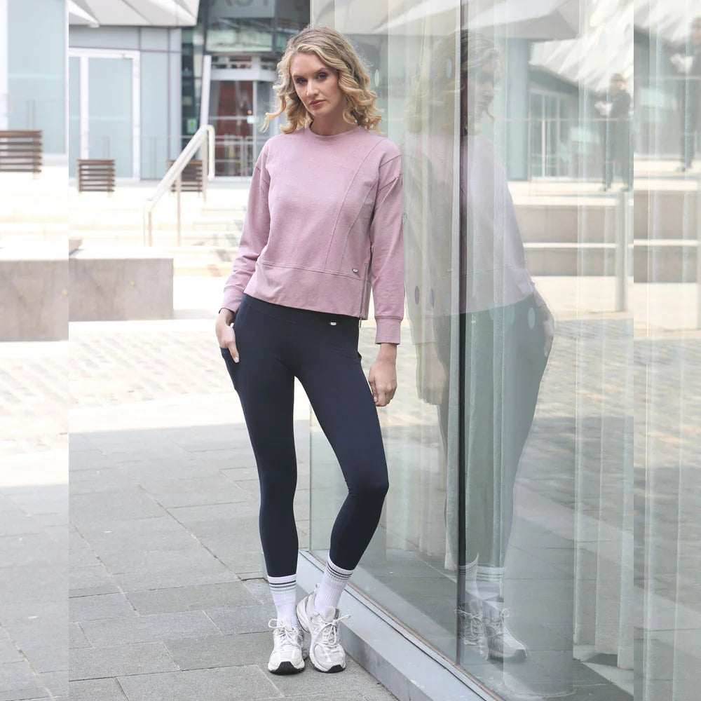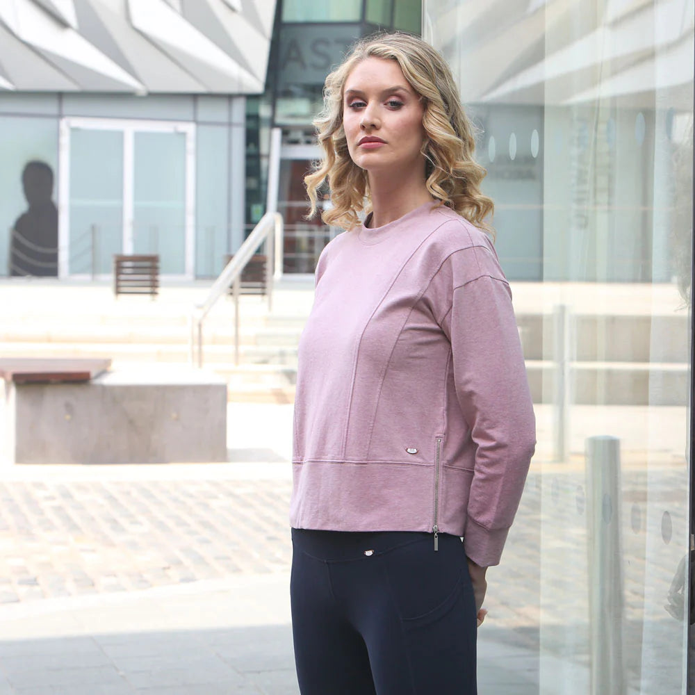 -Relax & Renew soft touch pink melange long sleeve top. Round neckline & zip detail to both sides. Subtle branding to hemline.