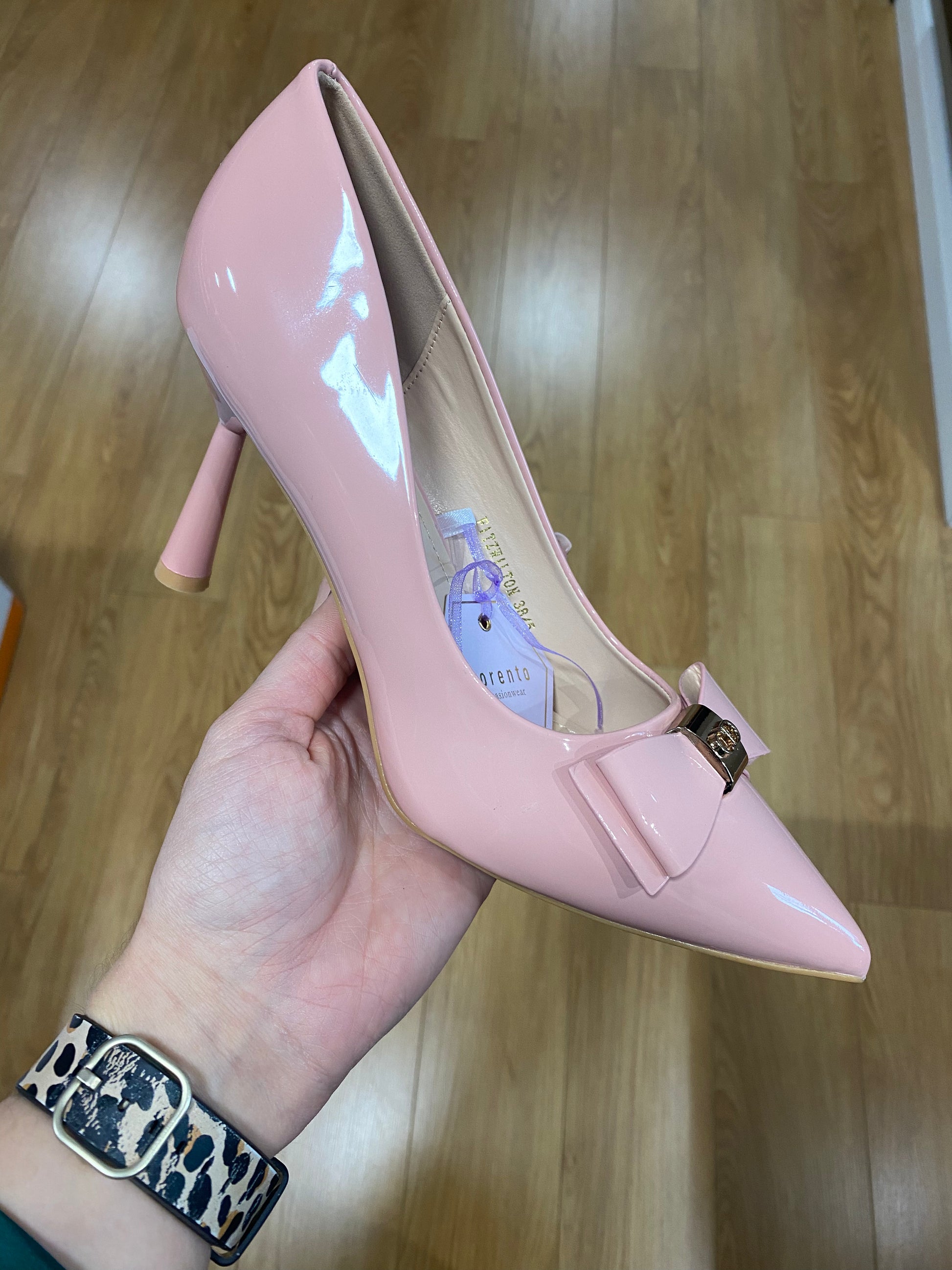 Sorento Heeled Pointed Court Shoe in Patent Finish with Matching Gold Bow & Asymmetric Heel