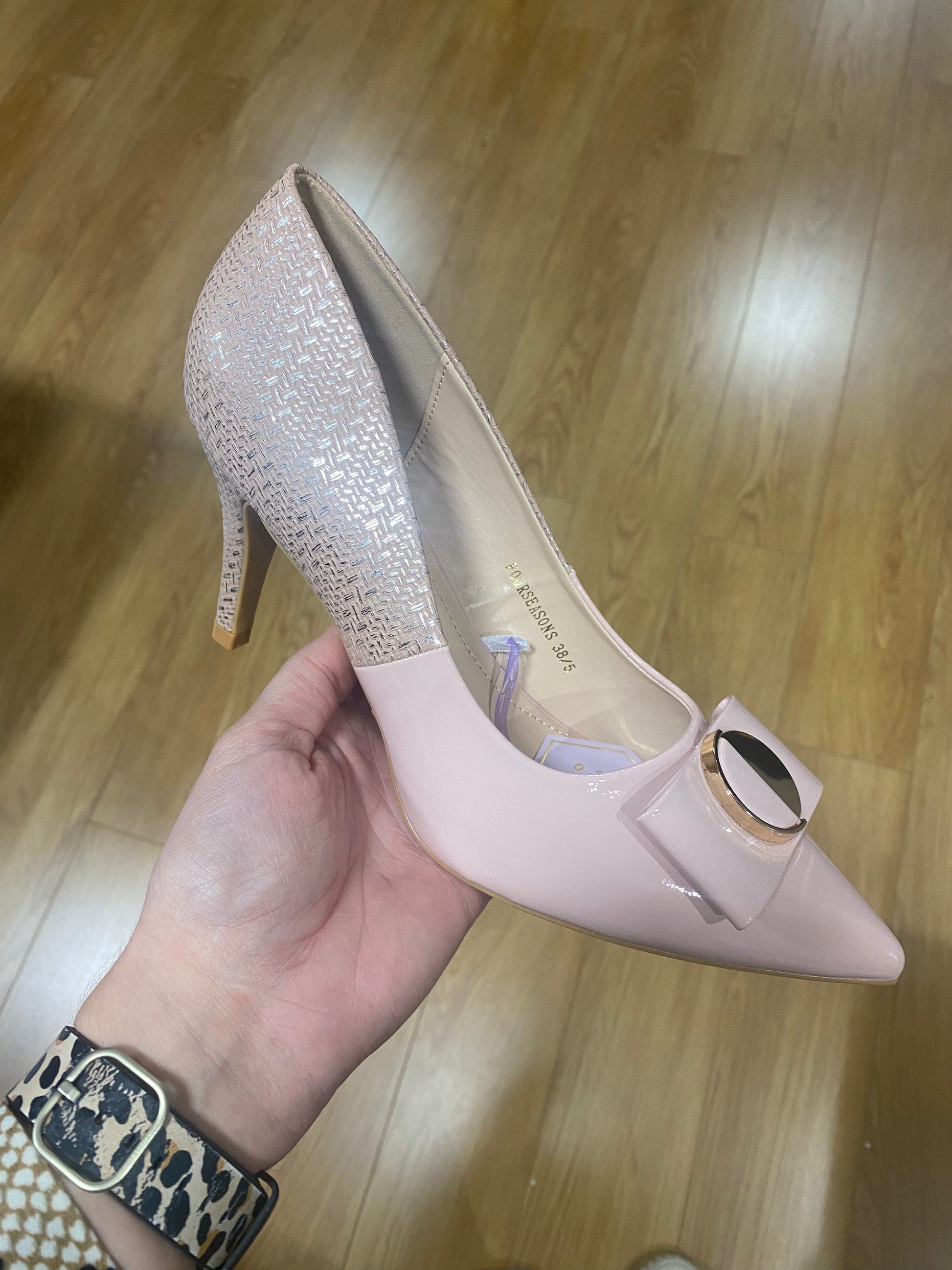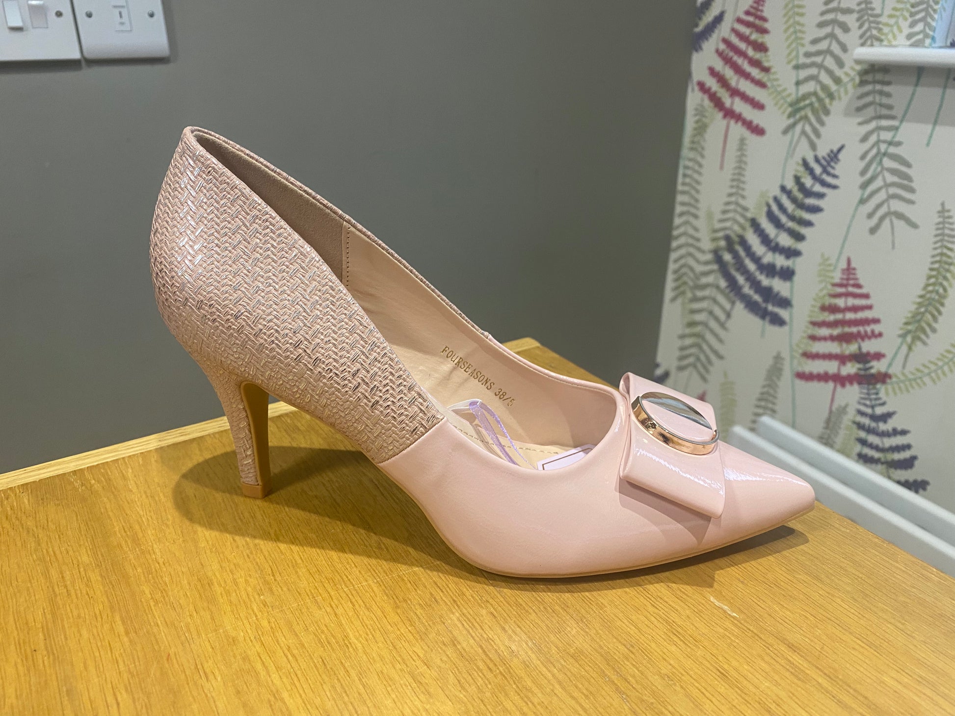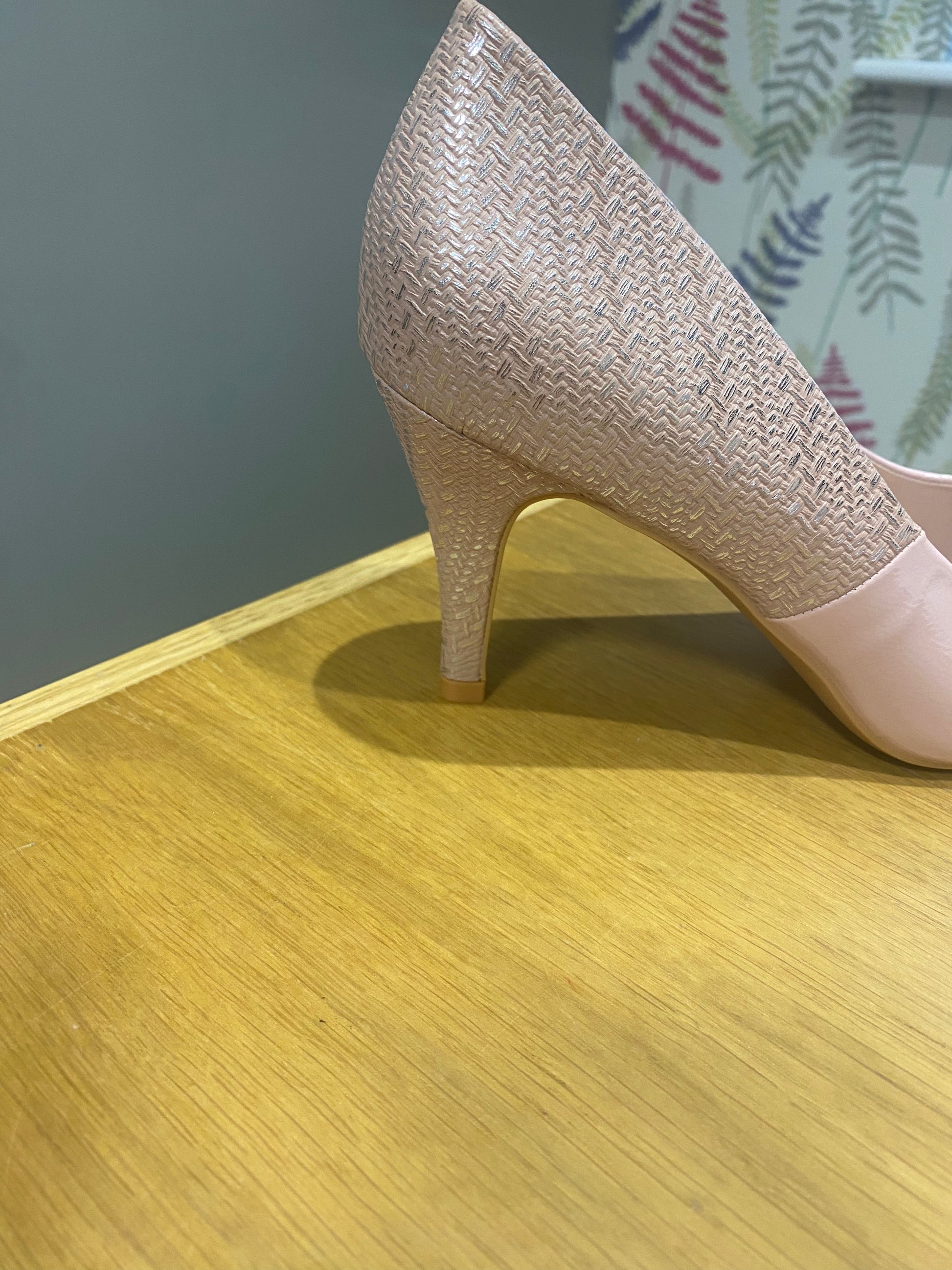 Sorento Heeled Pointed Court Shoe with Two Tone Colouring (Textile Effect Heel/Back & Patent Front), Finished with Gold Moon Bow