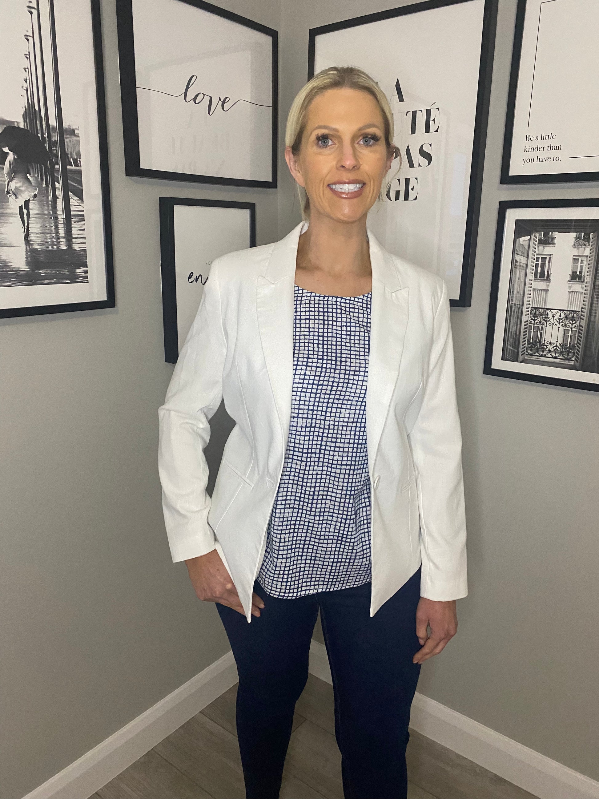 Classic light linen blazer in crystal white. Full length sleeves & lightly padded shoulders for shape. Single button fastening. True to size.