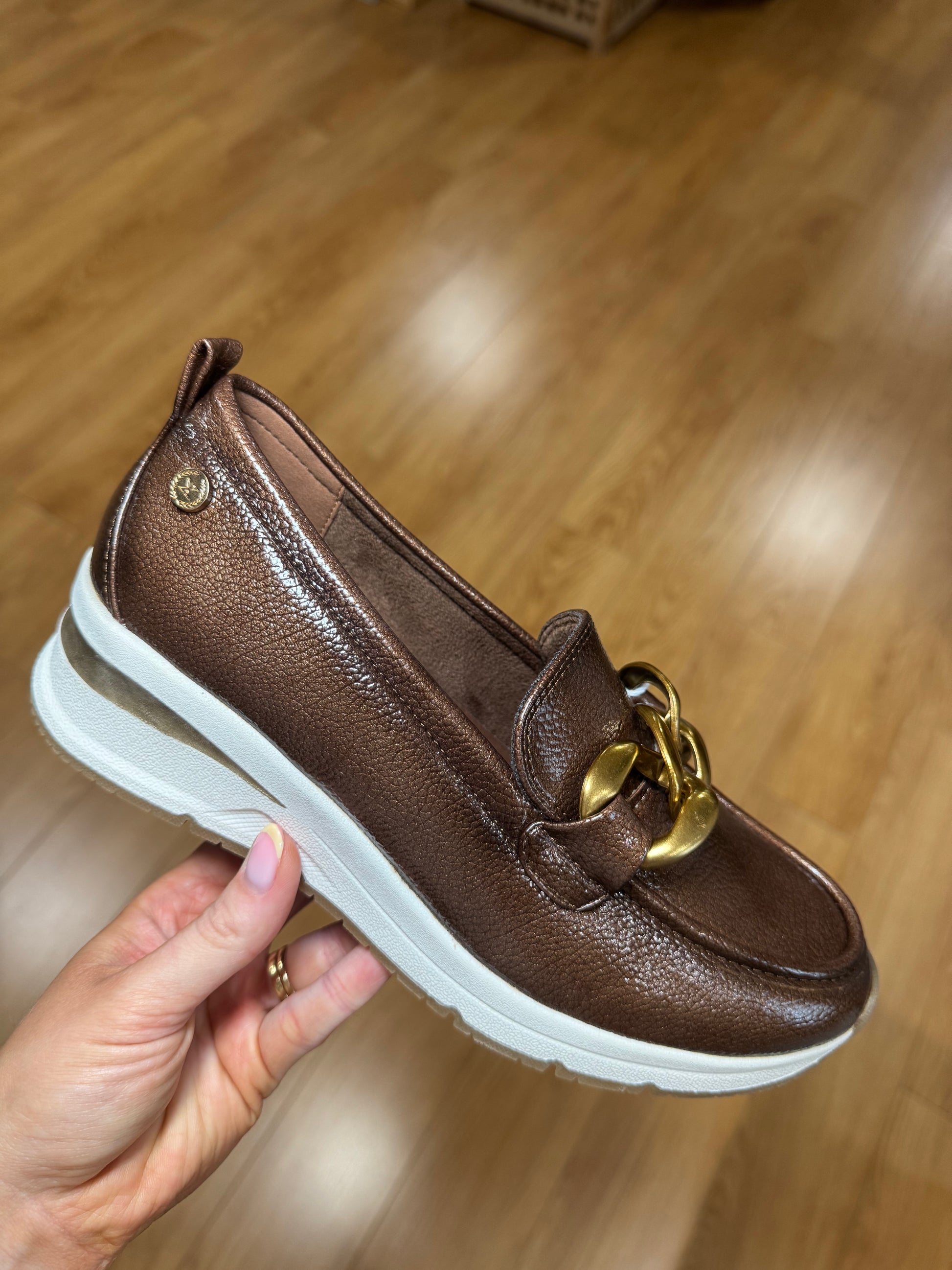 XTI Slip On Loafer with Small Wedge, Patent Finish & Large Gold Chain Detail