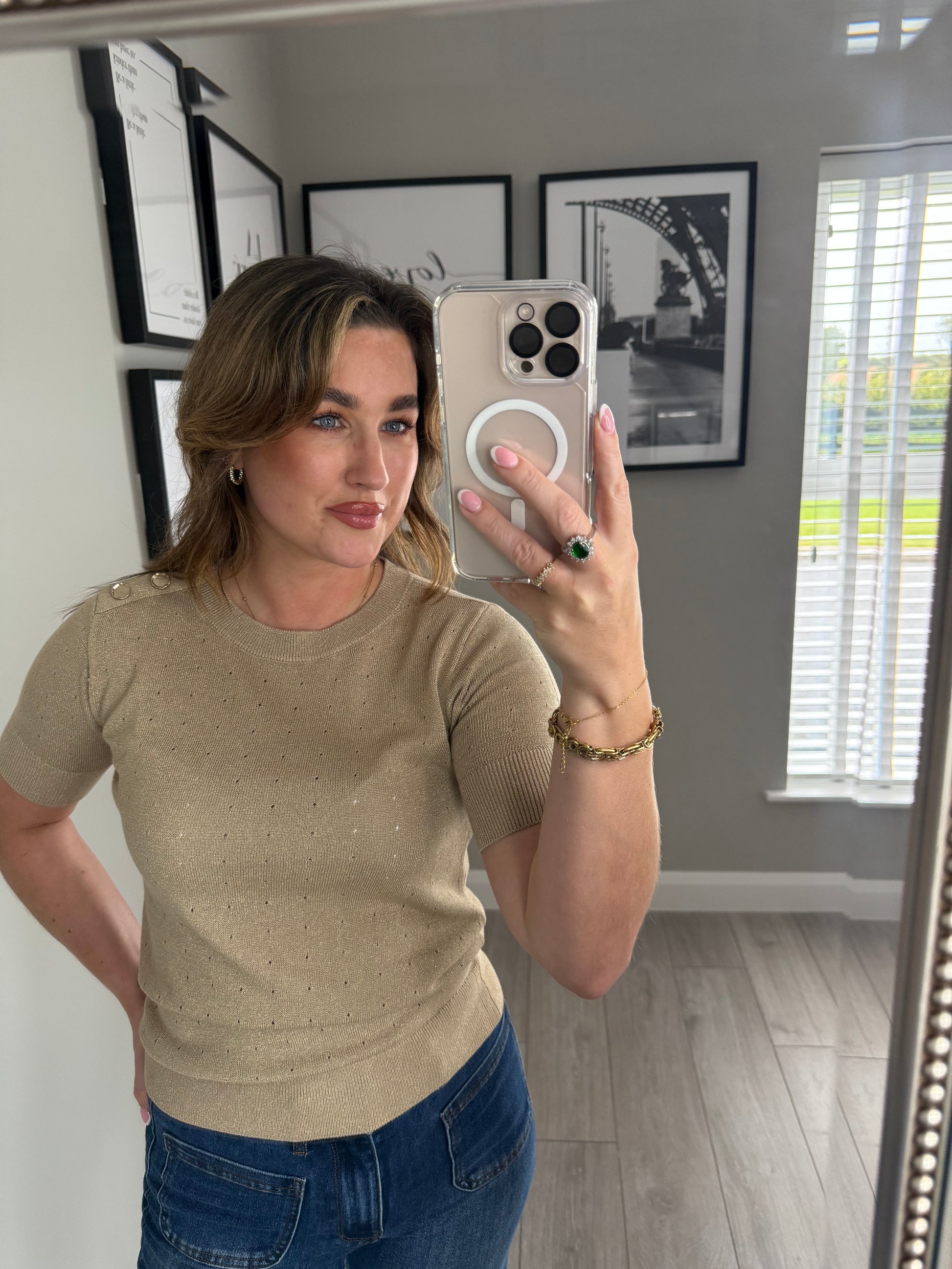 -Yest sand/beige short sleeved fine knit jumper with shimmer perforated design & gold button detailing to the left shoulder.