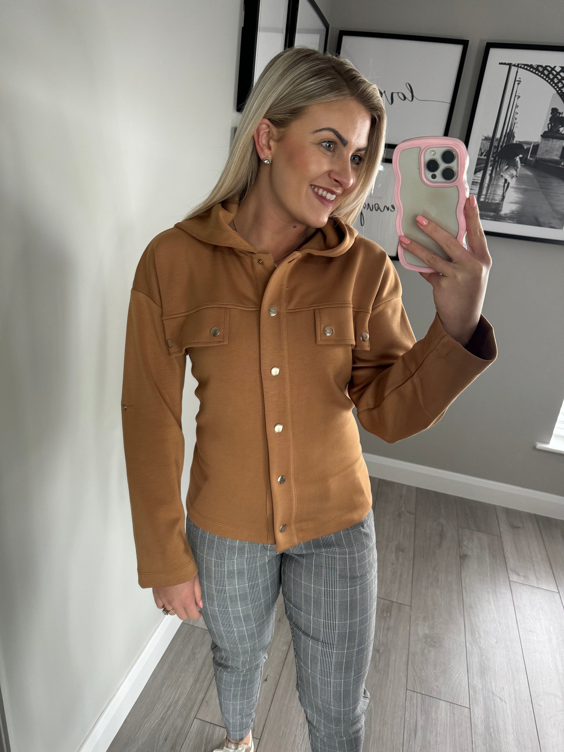 -Yest camel hooded jacket with gold hardware & pocket detail. In Yest classic travel fabric (soft touch, anti-wrinkle)