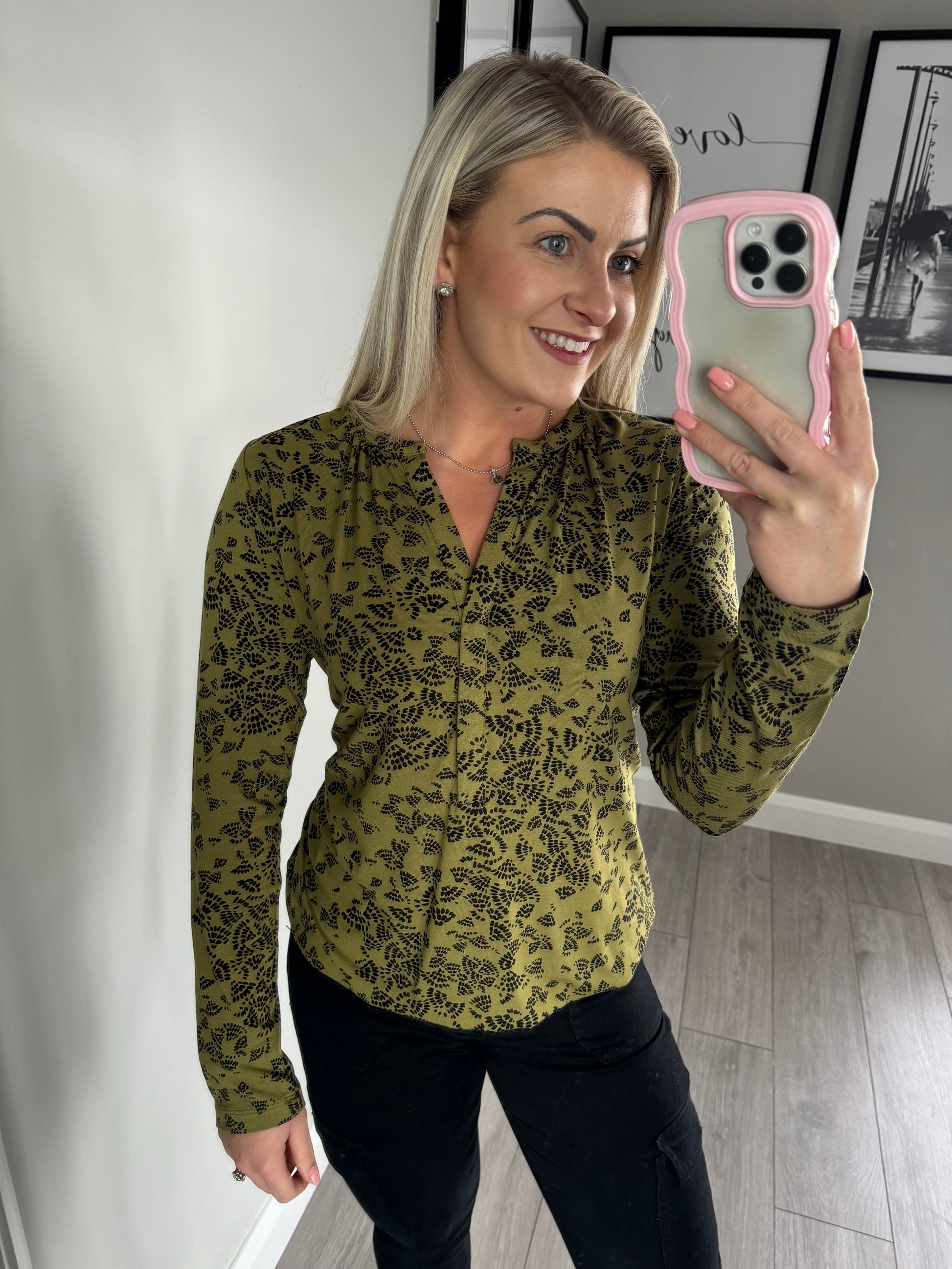 -Yest light khaki & black printed top with V neckline & elasticated balloon hem