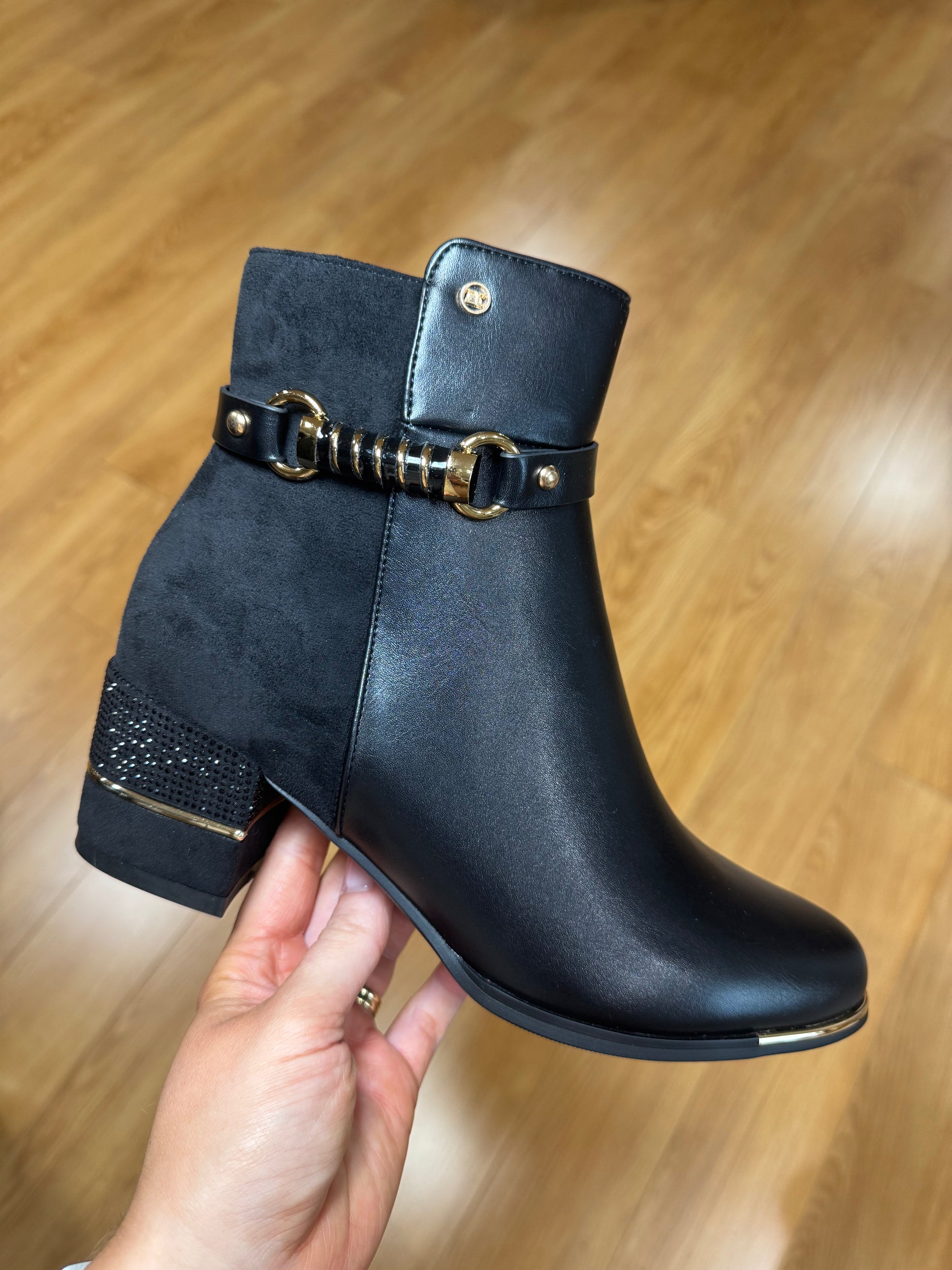 Zanni & Co Small Block Heel Boot with Embellished Detail, PU/Suede Mix & Gold Hardware Detail