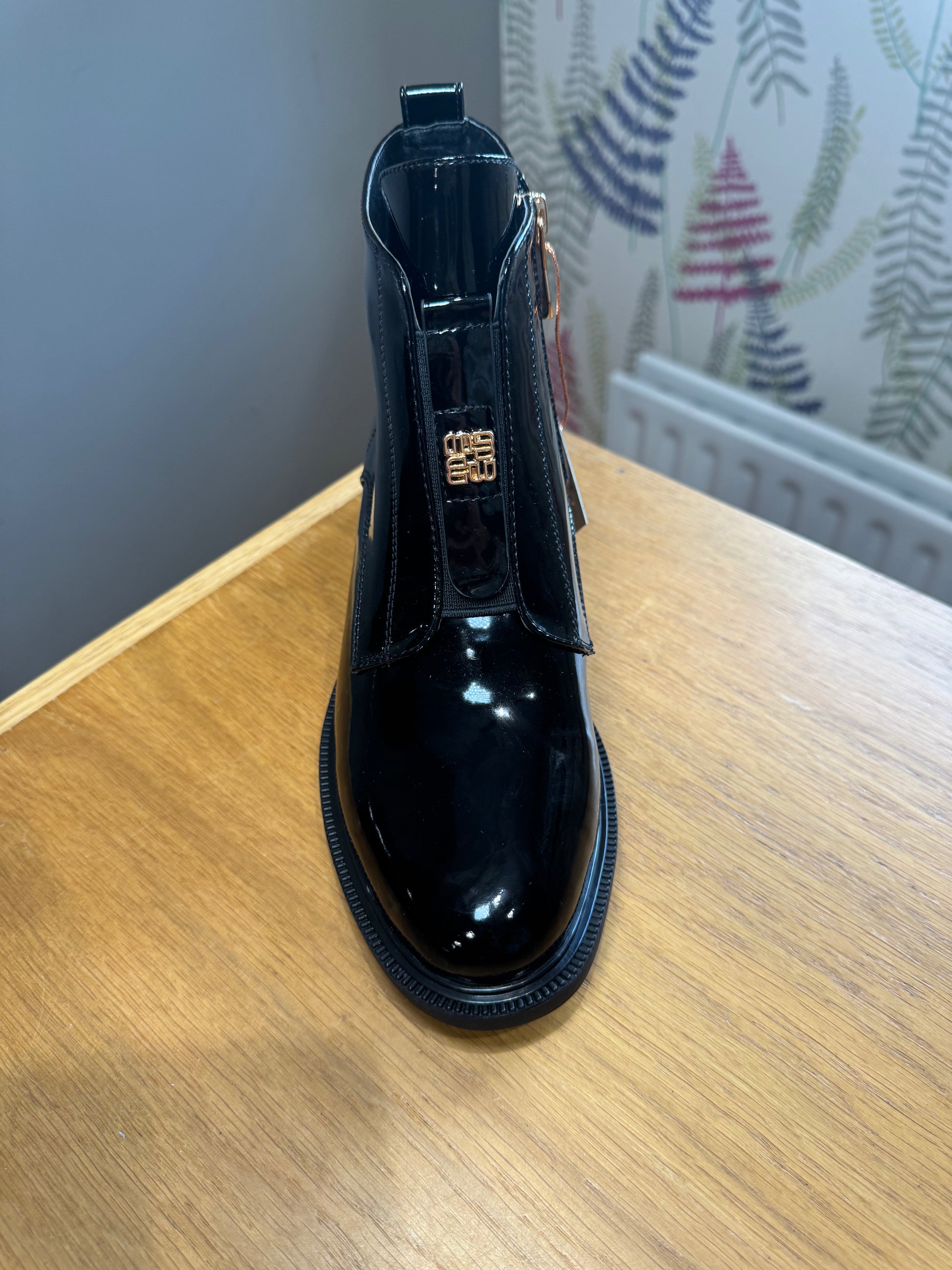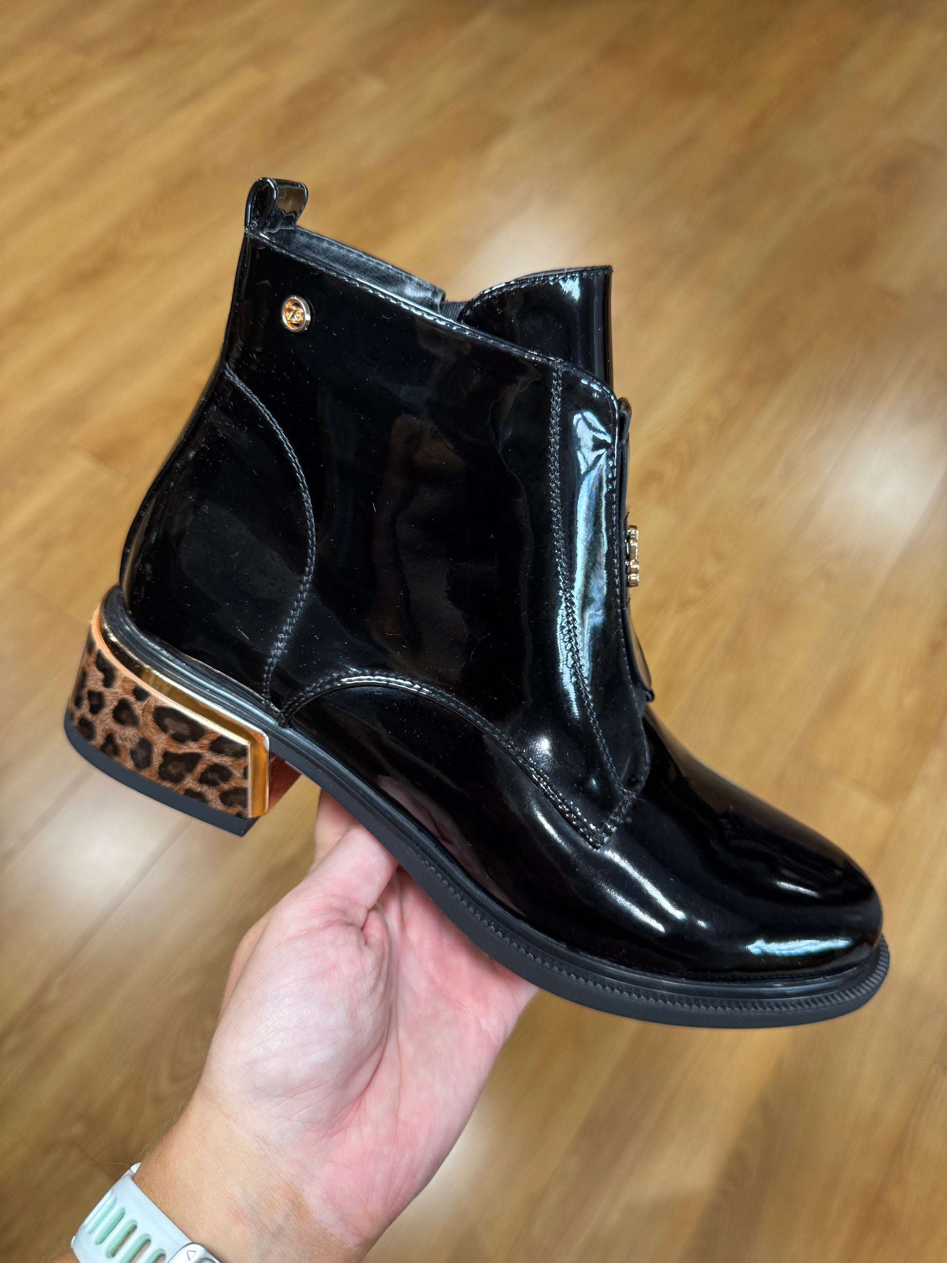 Zanni & Co Patent Finish Boot with Small Block Safari Print Heel & Gold Detailing