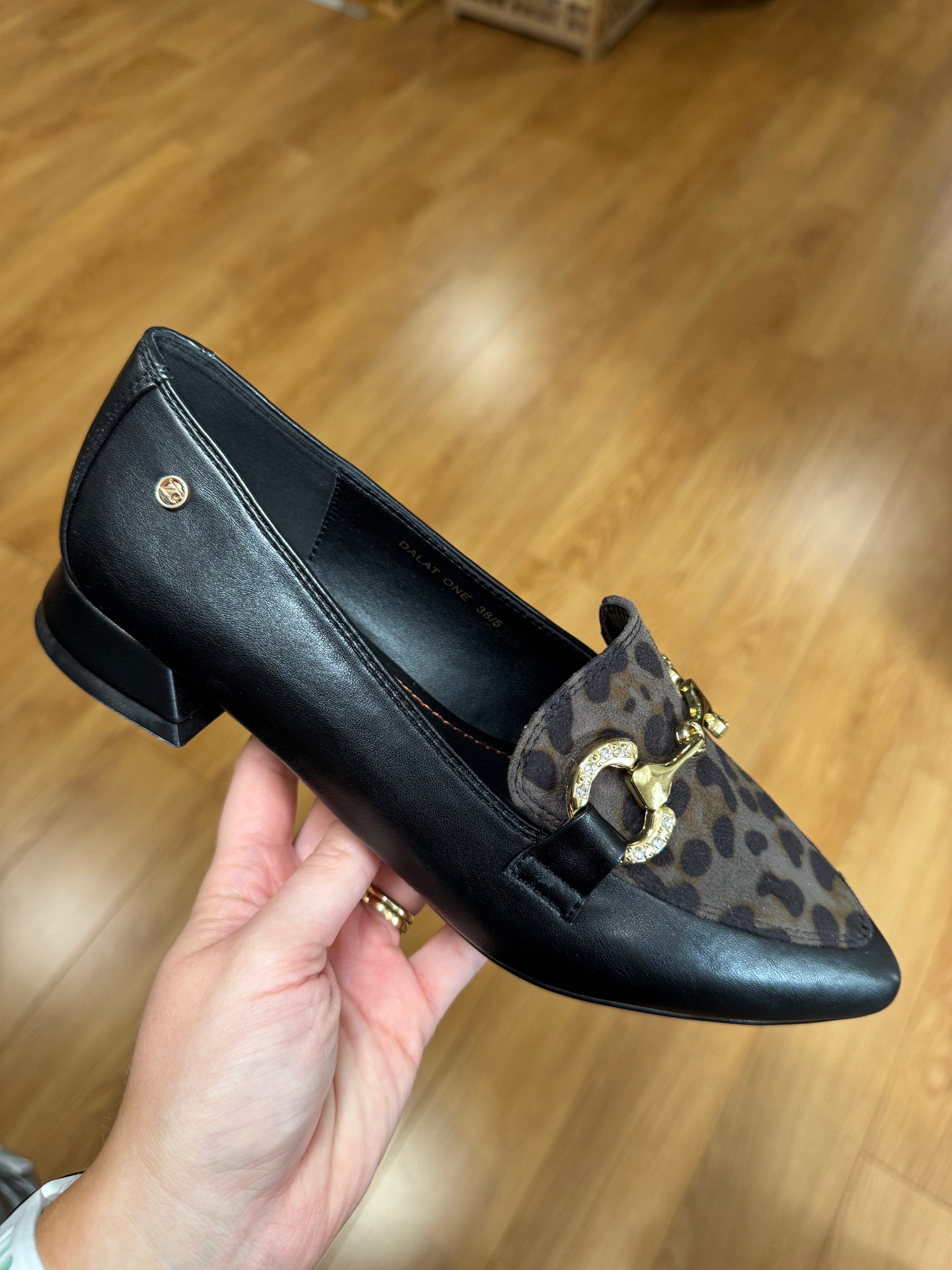 Zanni & Co Slip On Loafer with Small Asymmetric Heel, Safari Print & Gold Diamanté Snaffle Buckle