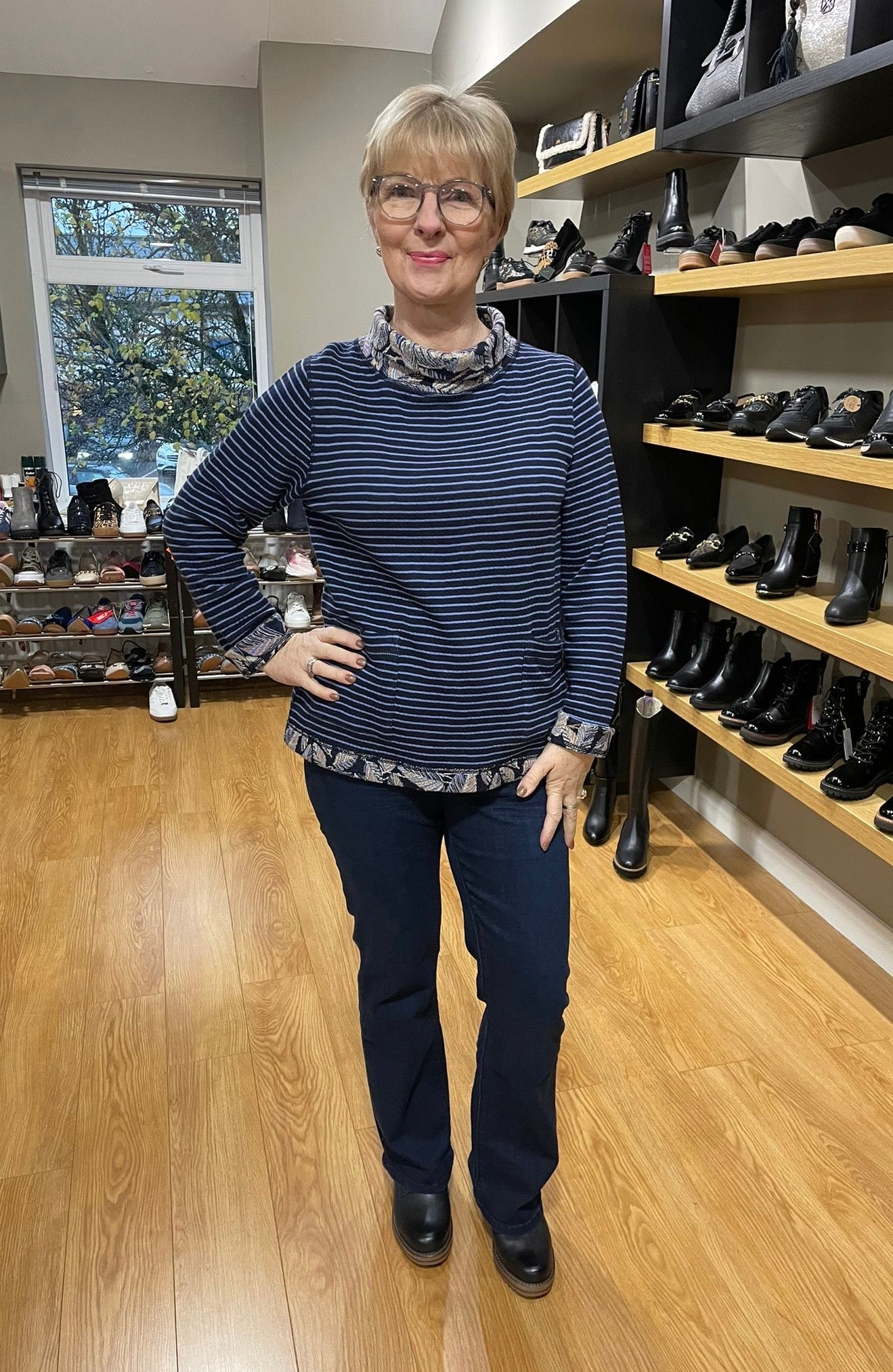-Adini 'Bhavi' autumn leaf/navy striped top. Fully reversible giving two designs/prints in one. Short roll neck in soft cotton jersey jacquard.