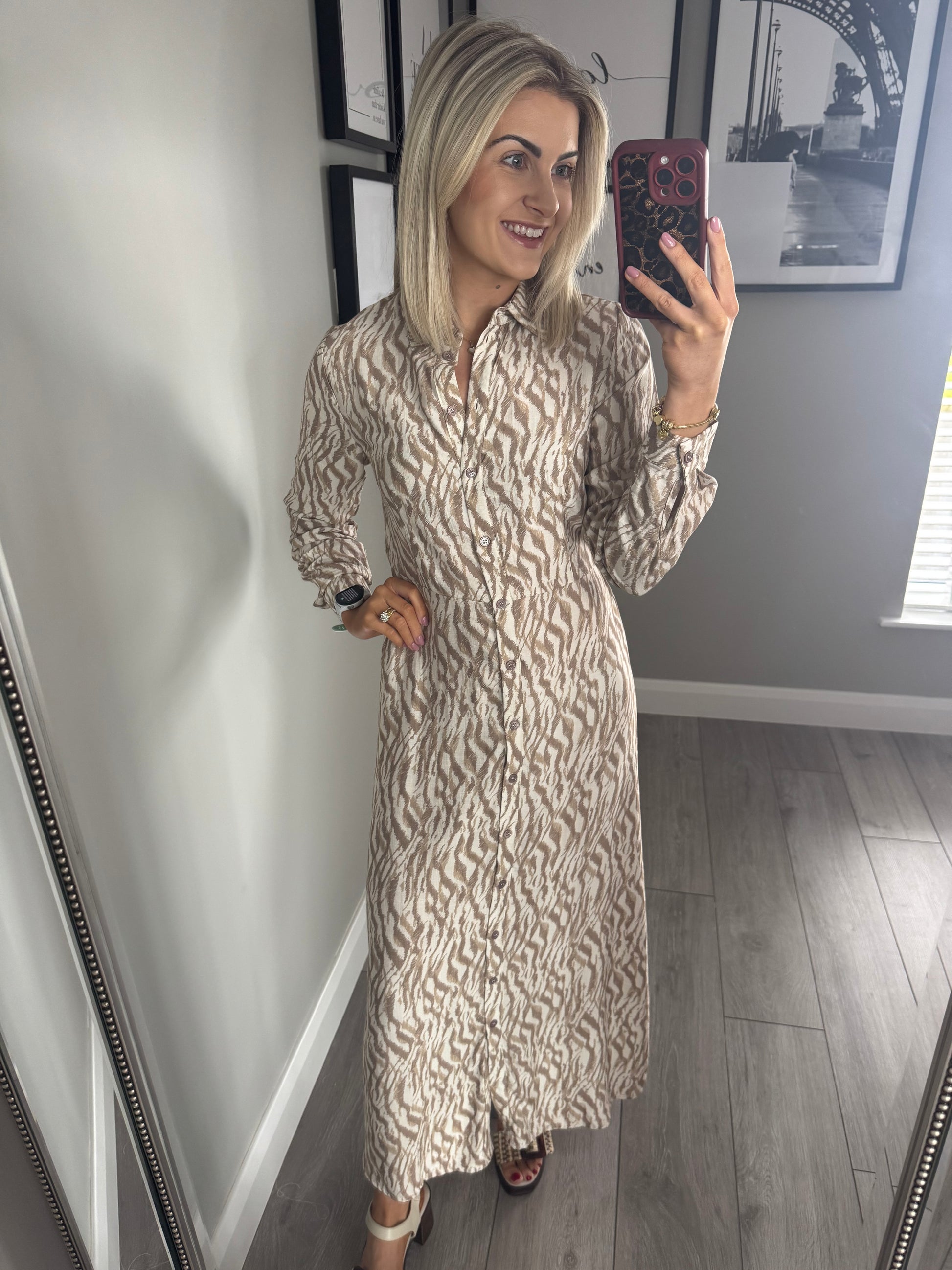 -B.Young KYikaia birch tiger multi (beige multi print) button through shirt dress. Classic collar.