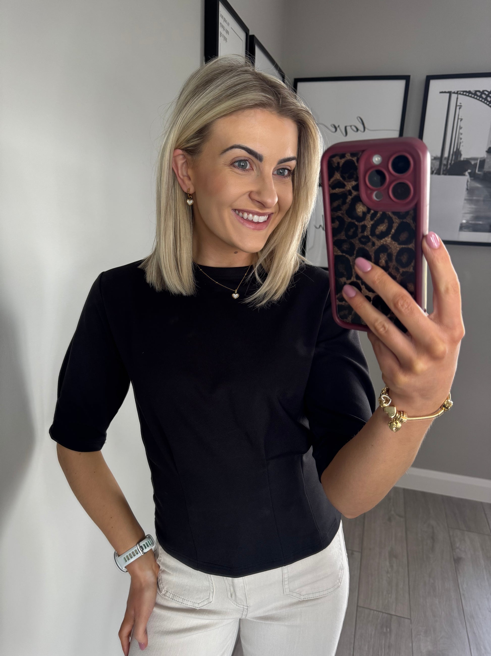 -B.Young black short sleeve top with fitted pintuck waist & sleeve.