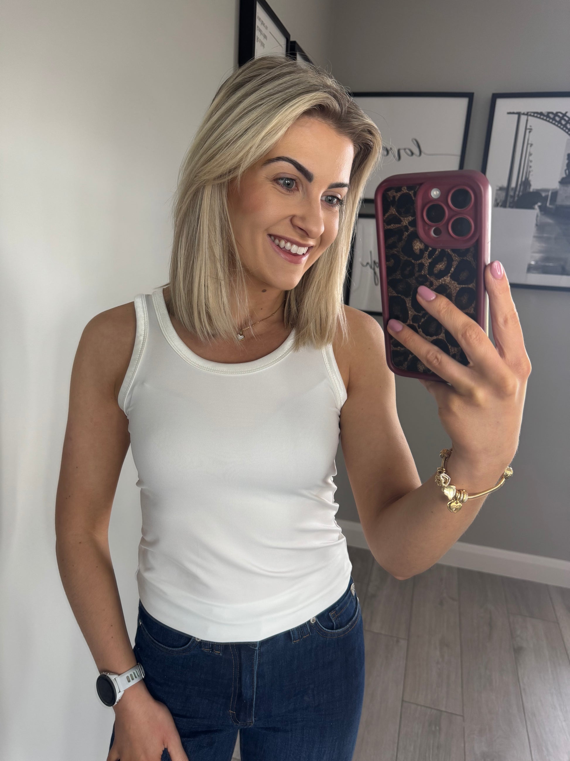 -B.Young Iane Sin B off white vest top with silk edging. Stretch fabric.