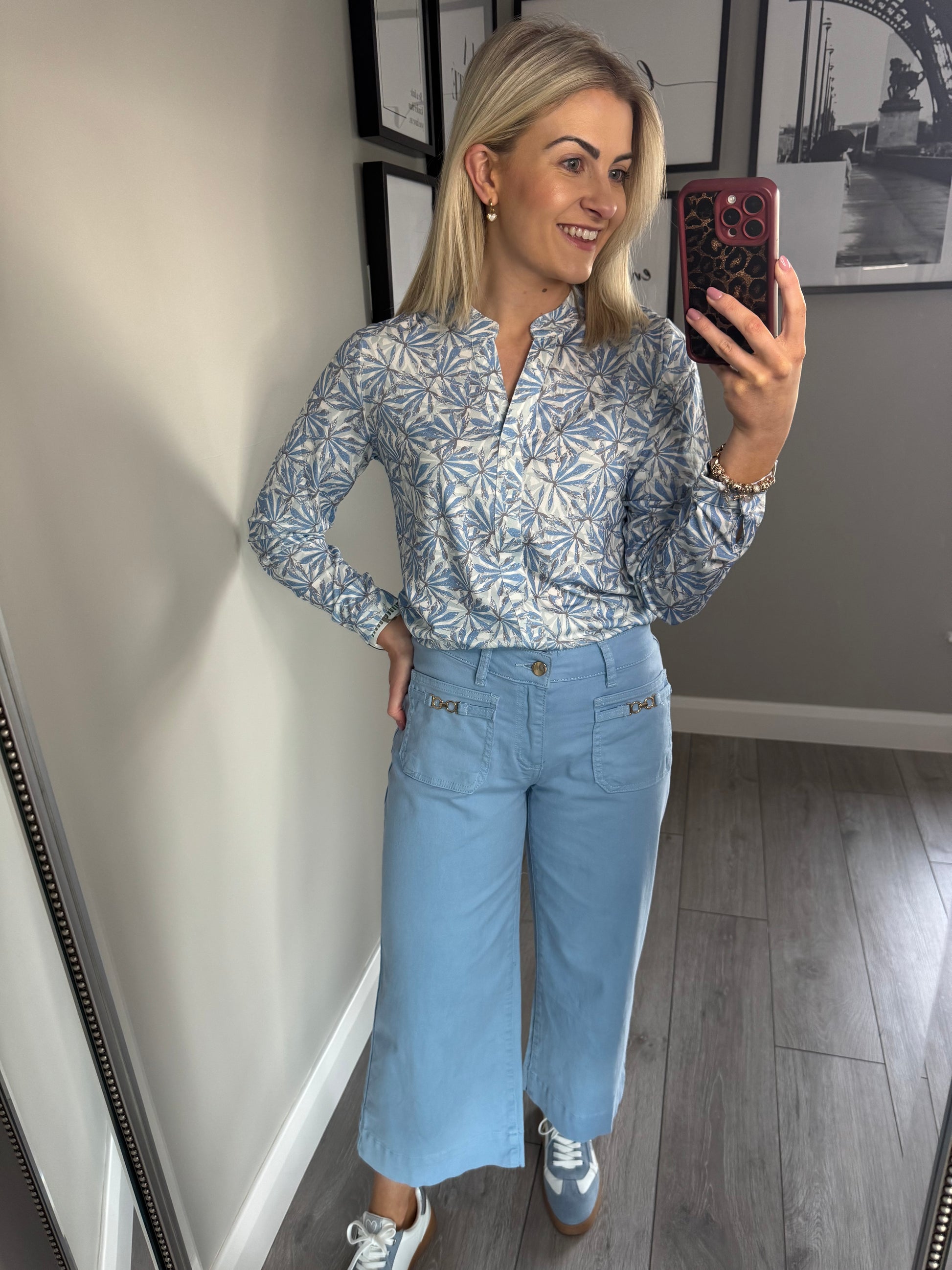 -Jessica Graaf light blue & sage green printed blouse with V grandad neckline.