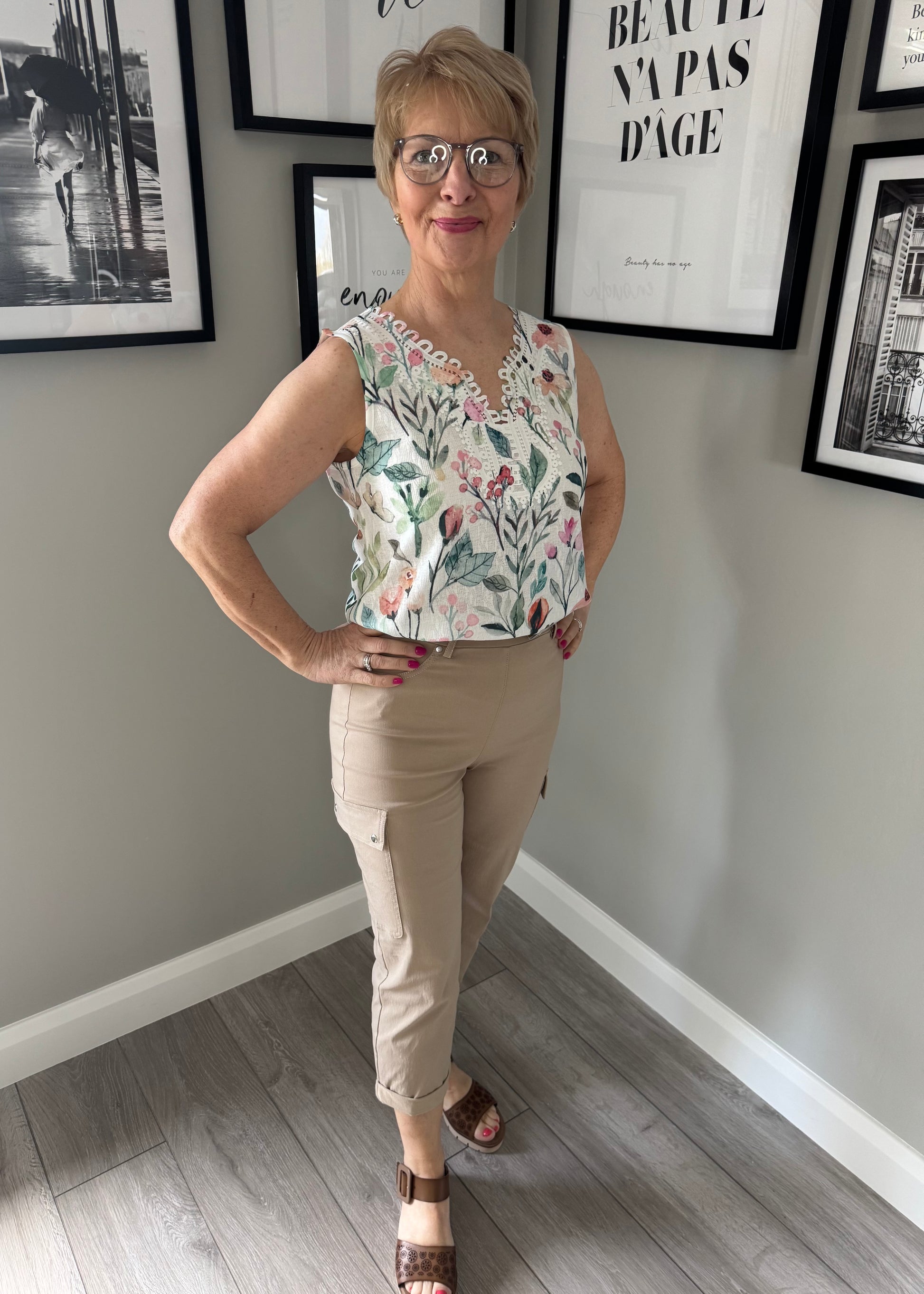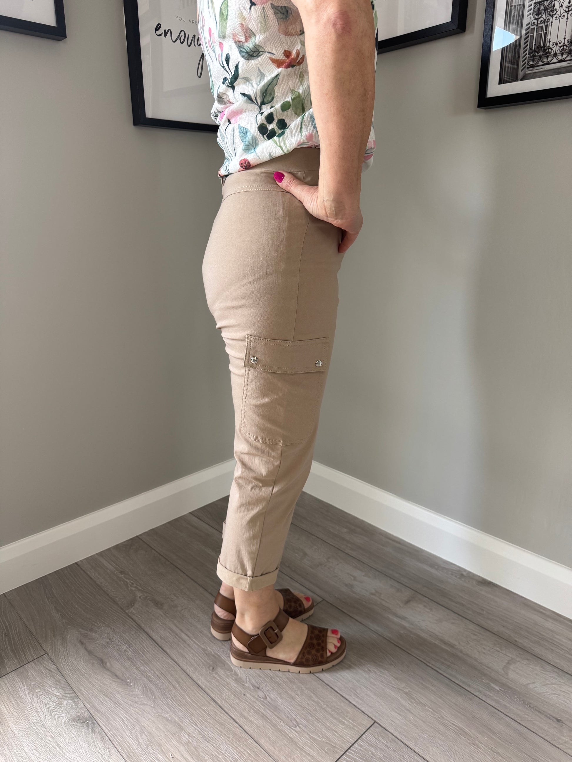 -Classic pull on bengaline crops (22 inch) with cargo style pockets & turn up hem detail.