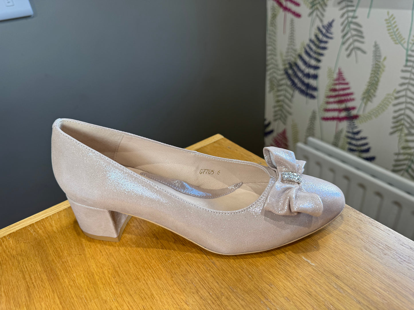 Emis Soft Leather Court Shoe in Shimmer Finish & Diamanté Bow Detail. Small Block Heel.