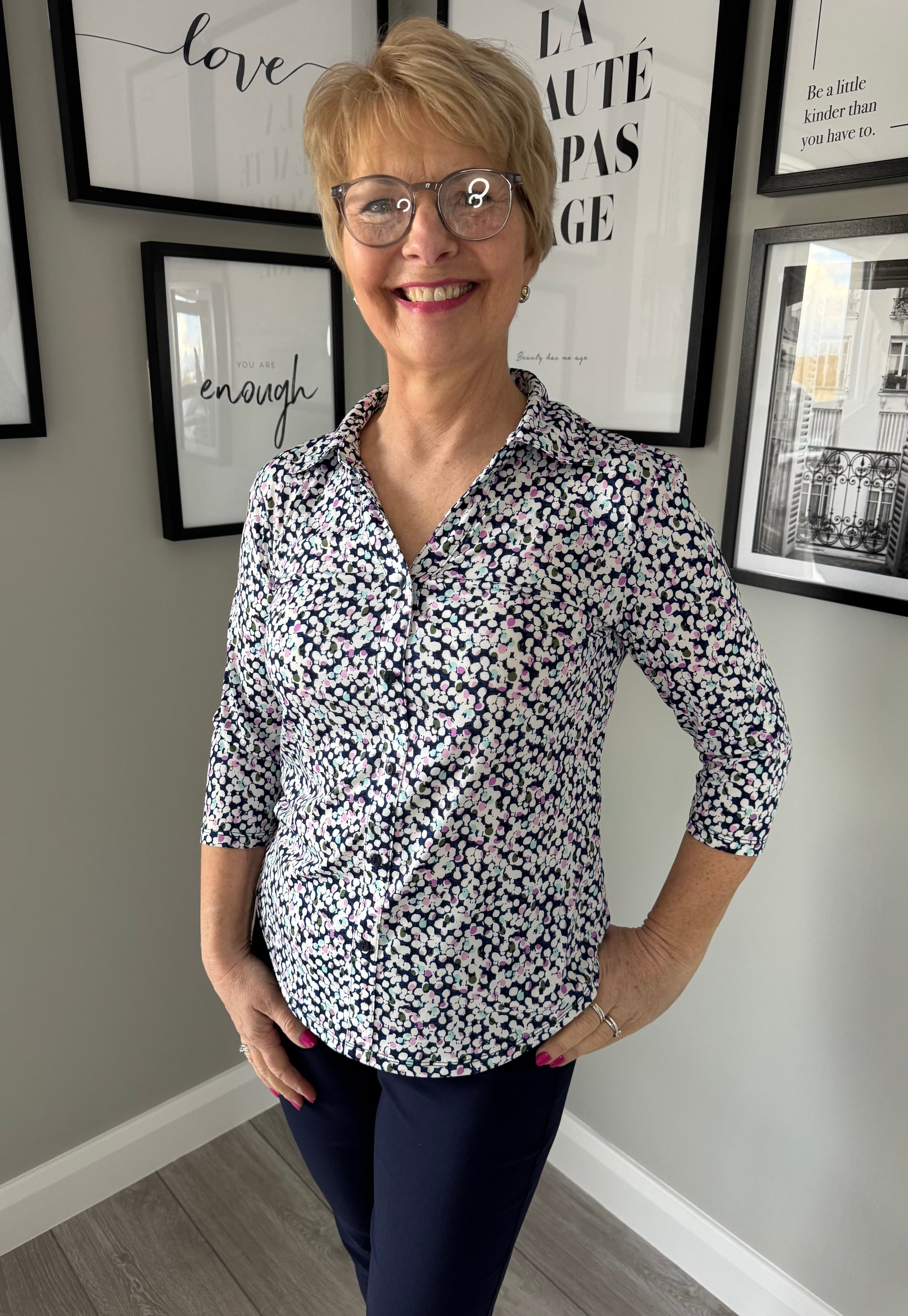 -Emreco navy, white & pink multi three quarter length sleeve blouse. V neckline with half button opening & pocket detail.