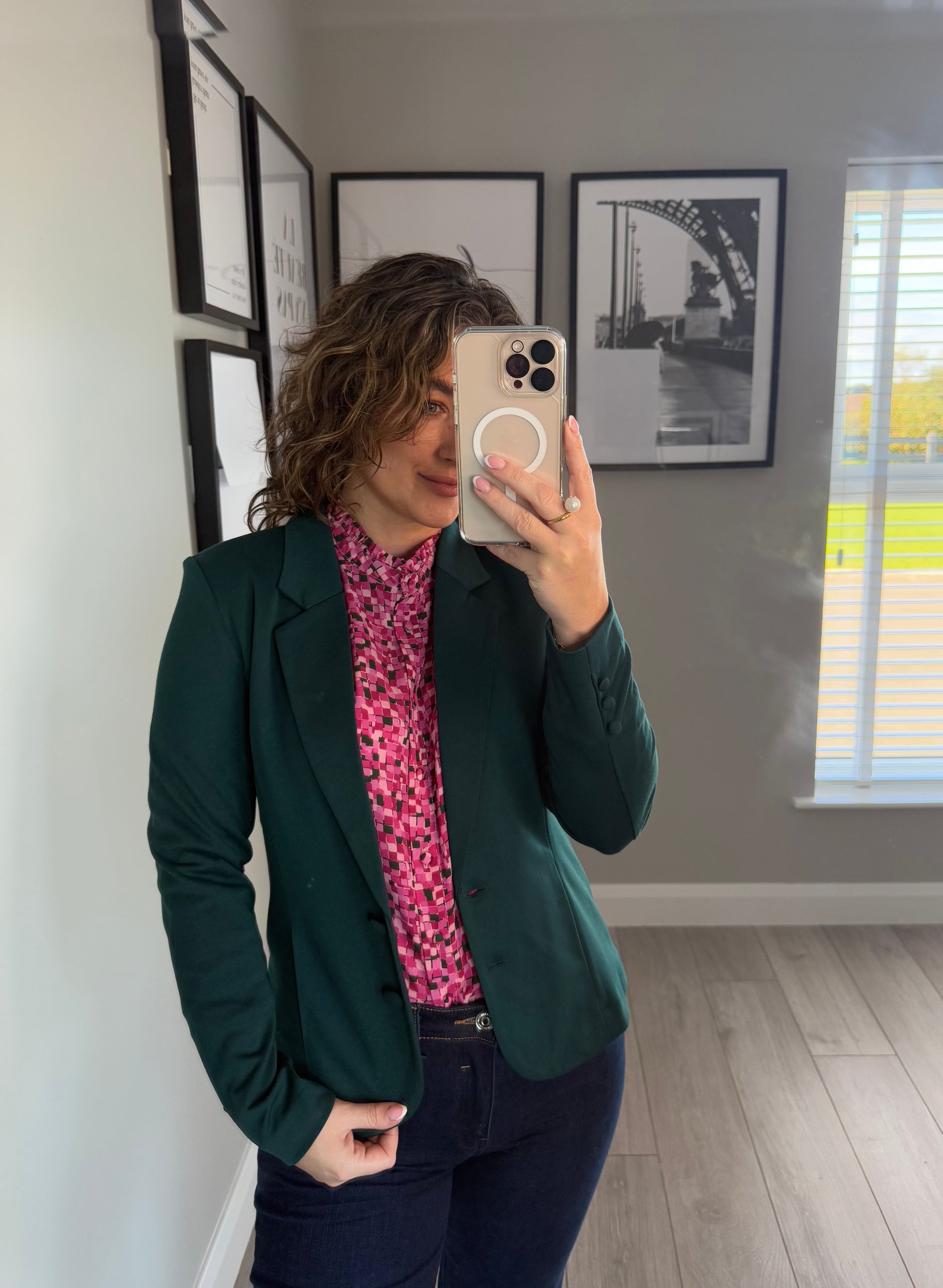 -Freequent forest green fitted jersey blazer with flat lapels & double button fastening. Small shoulder pads for added shape with subtle front pockets.
