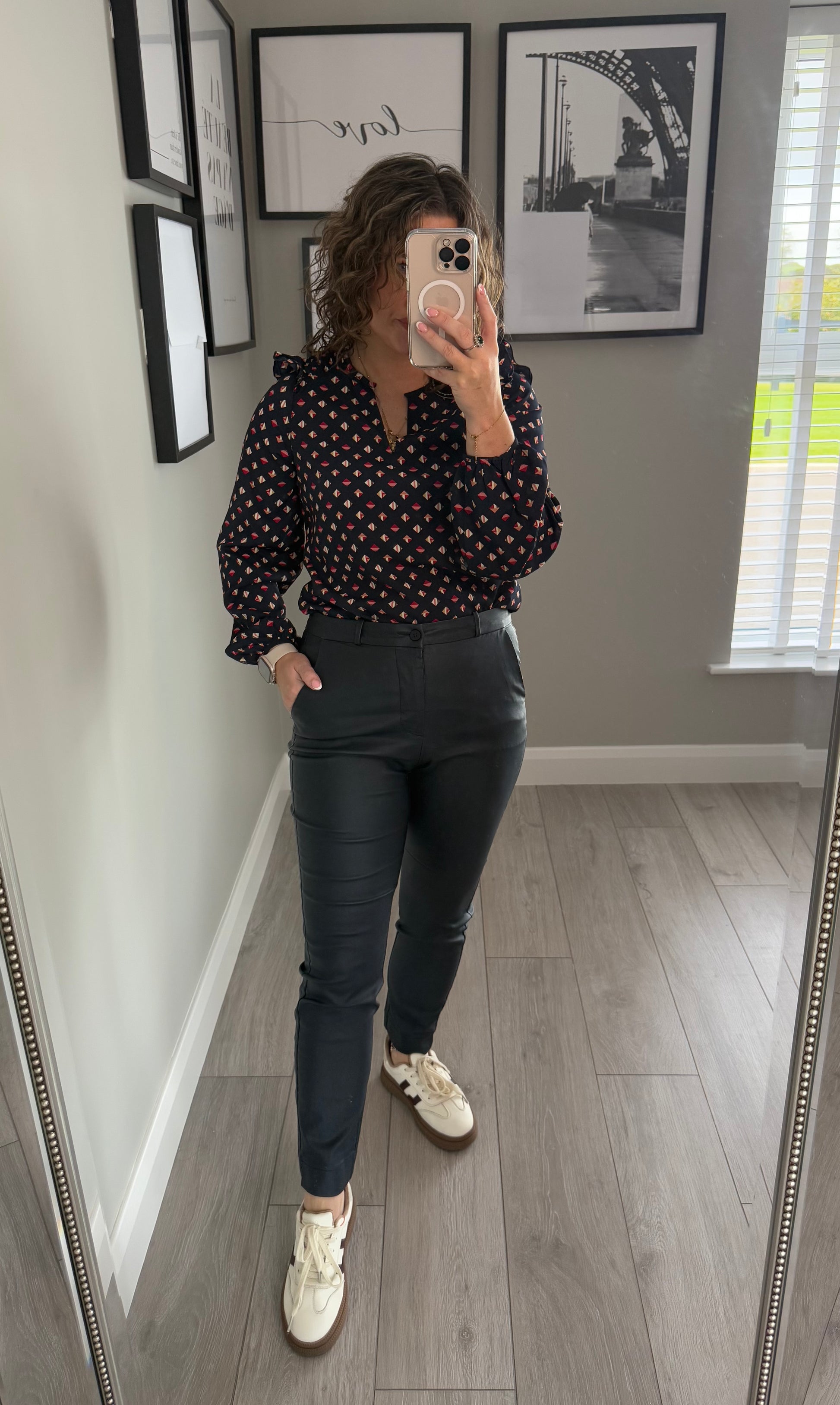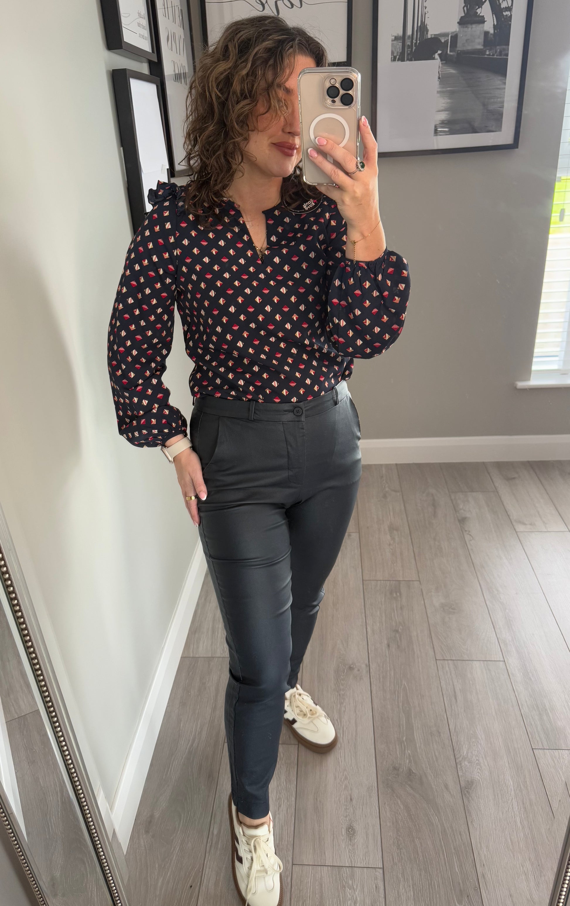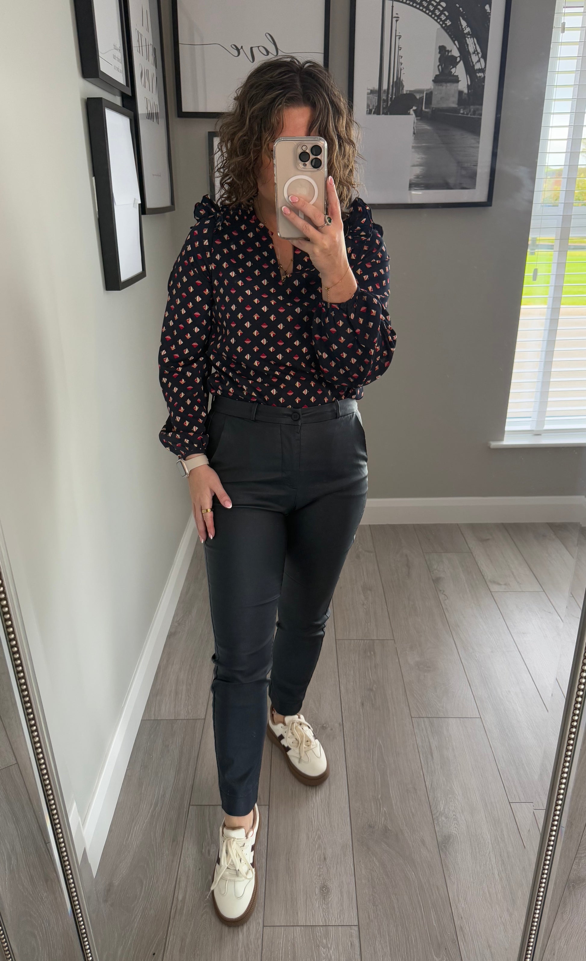 -Freequent navy pu leather cigarette style trouser. Button & zip fastening with two side pockets, finished with slit to the outside of hemline, suitable for any footwear.