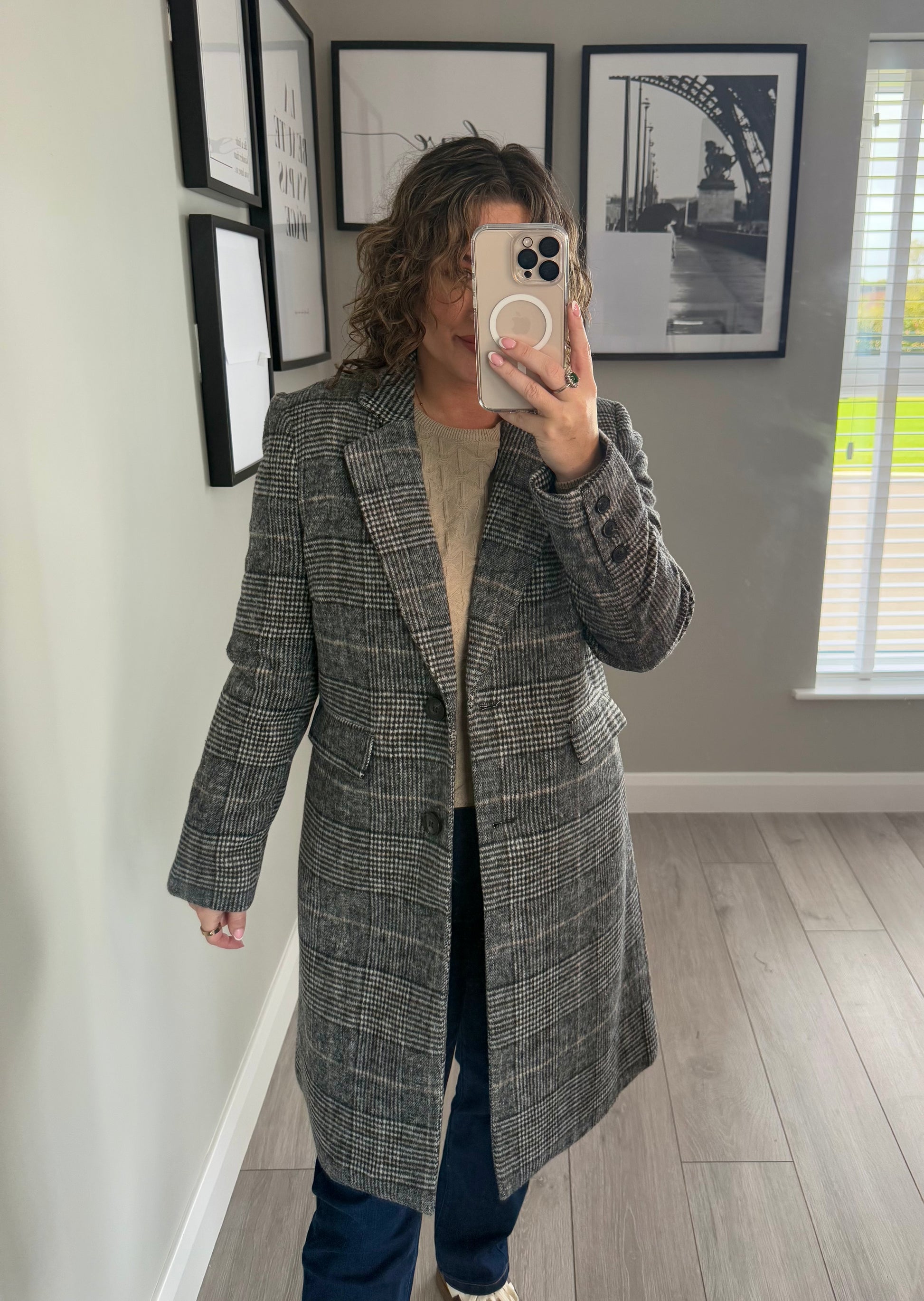 -Emreco grey, black & beige checked coat. Single breasted finished with flat lapels, double flat pockets & double button fastening.