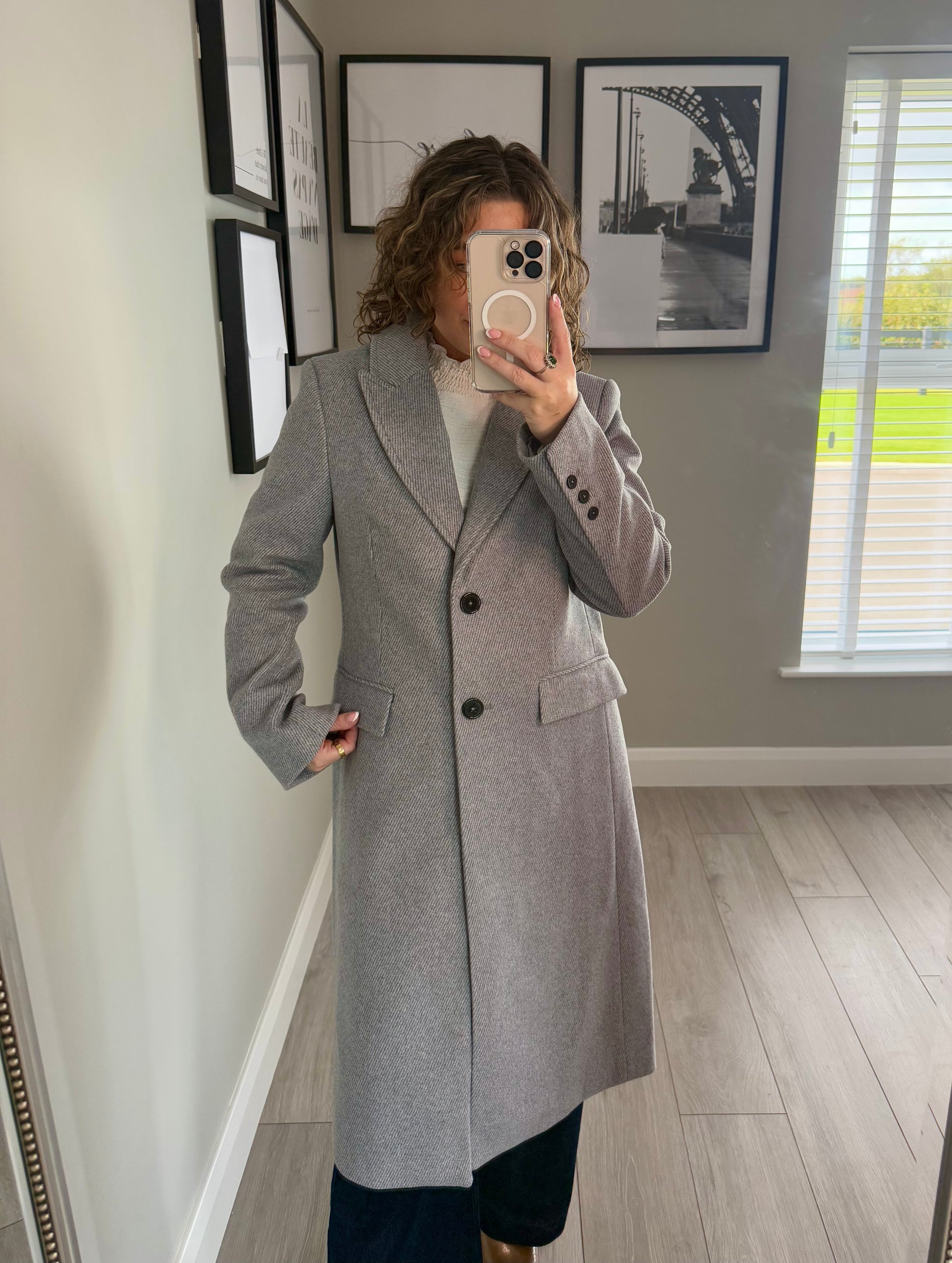 -Emreco grey soft twill fabric coat. Longline length featuring a single breast with flat lapel design & two flap pockets.