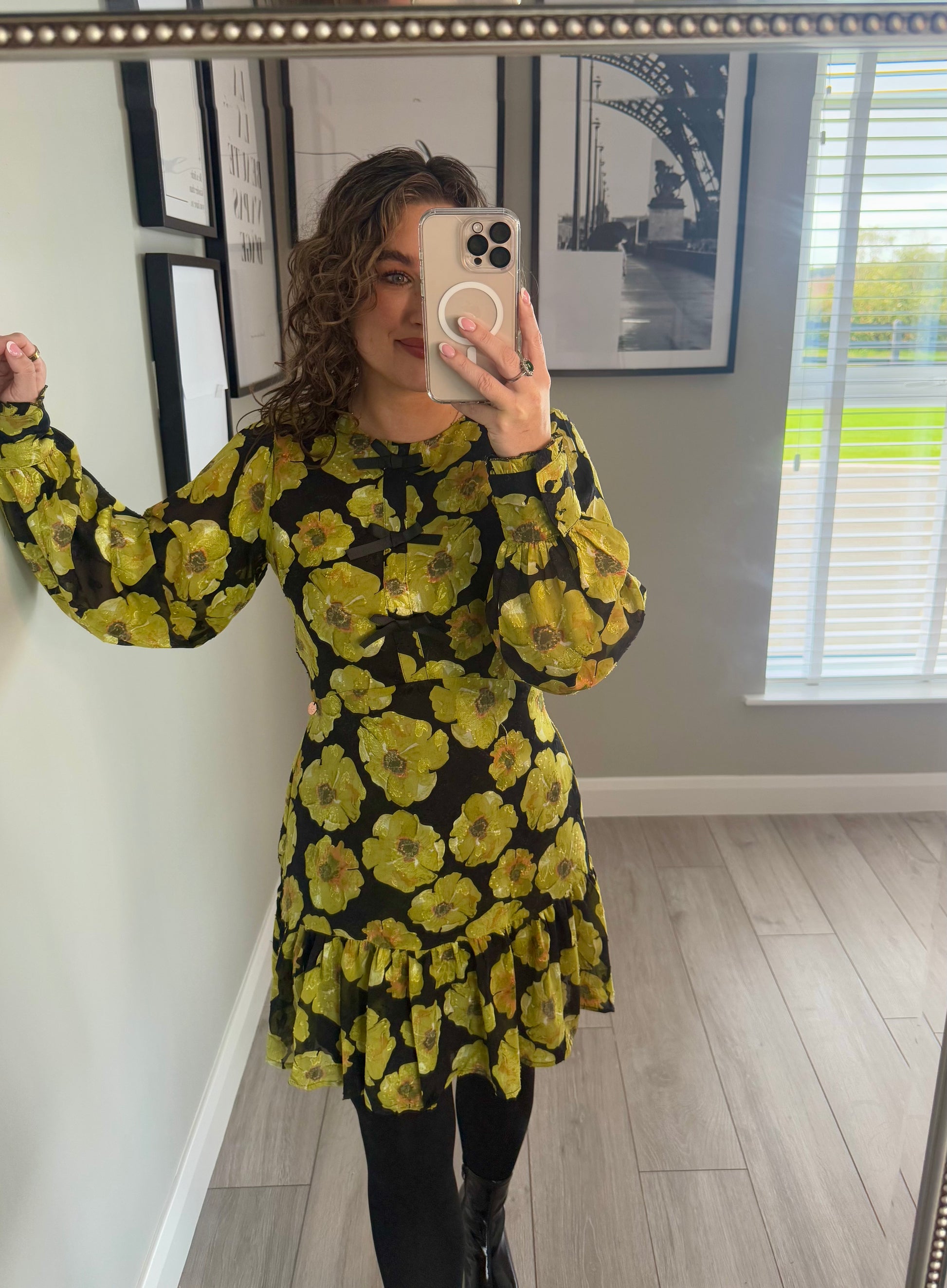 -Rant & Rave lime green & black bold floral printed dress. The Daina dress sits just above the knee with a lightly flared hemline, three quarter sleeves & delicate bow detail draping from the neck to waist.