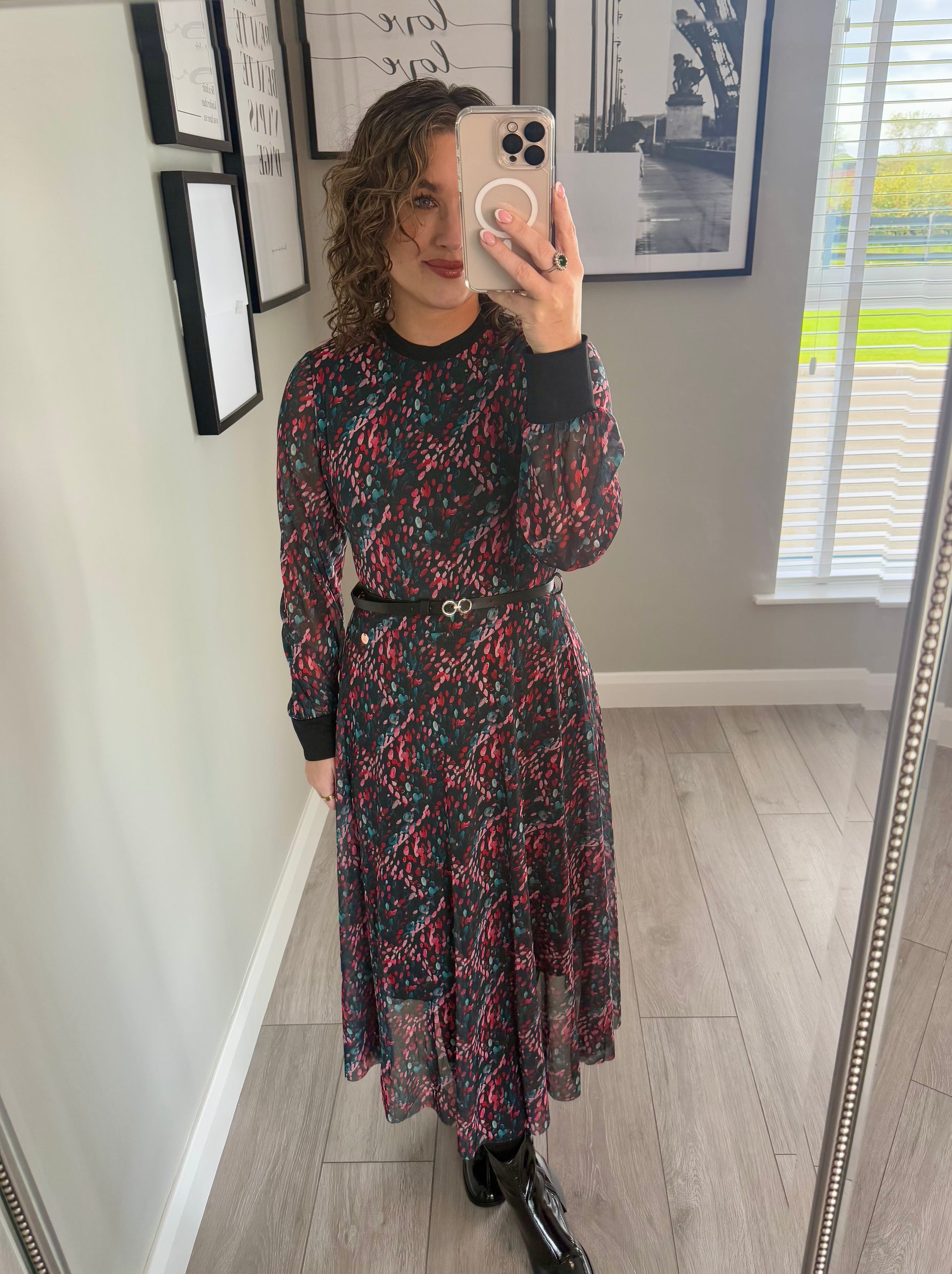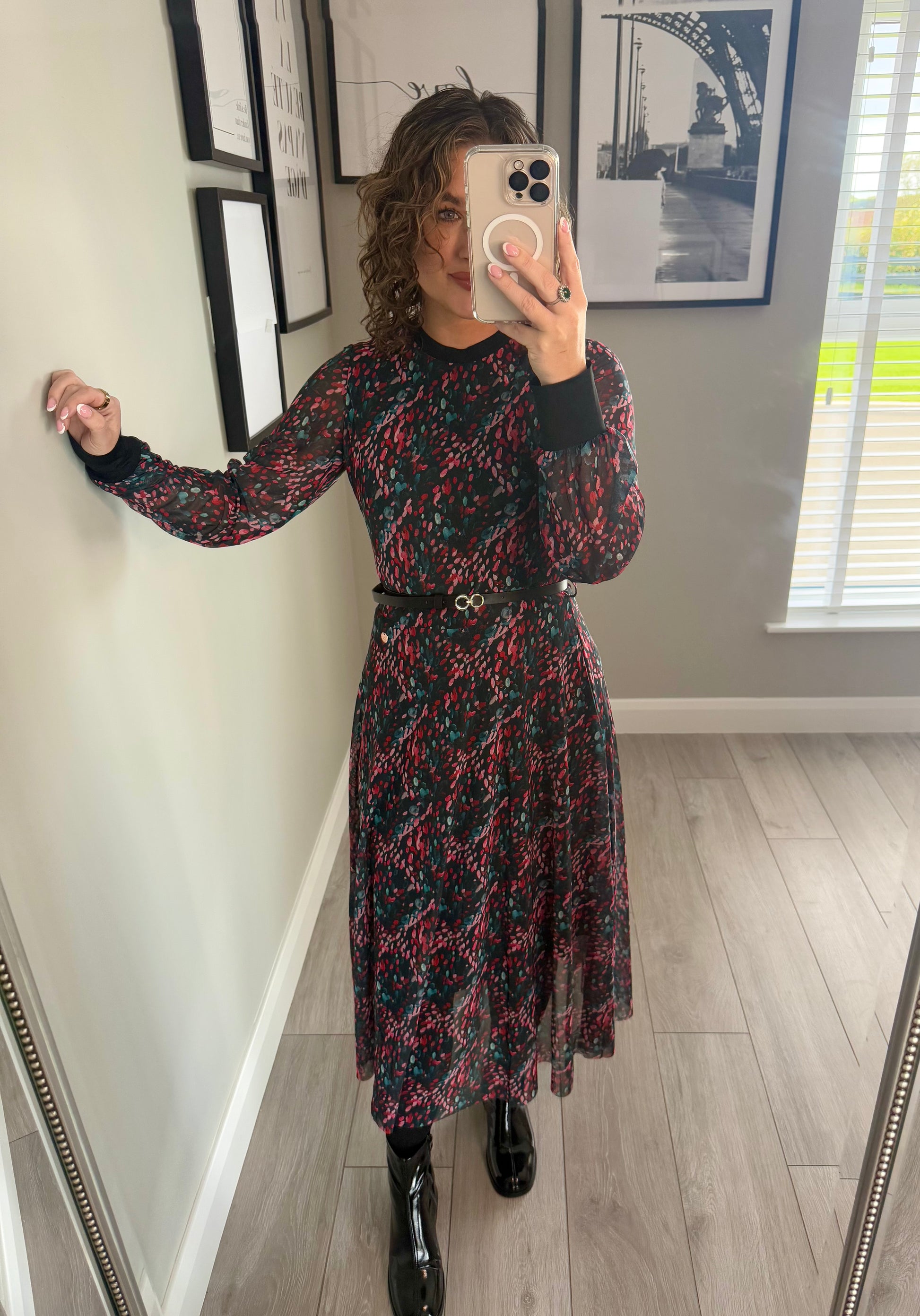 -Rant & Rave teal, pink, red & black abstract printed dress. The Gwyneth dress is a fully lined chiffon with ribbed cuff sleeves & round neckline giving it a mix of smart & casual. Comes with matching black belt for waisting & to complete the look.