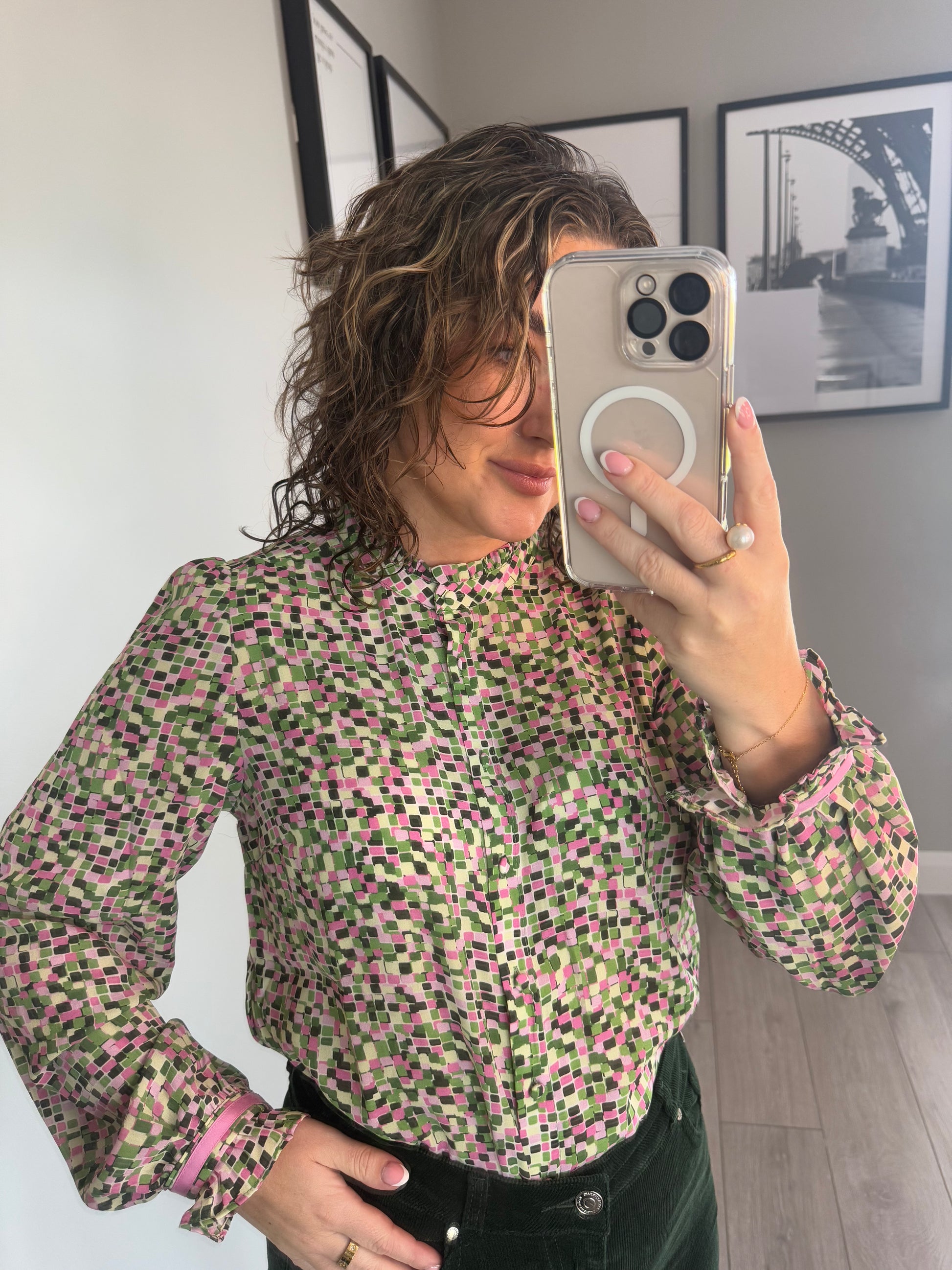 -Rant & Rave multi tonal pink & forest green blouse. Striking print with matching button through, finished delicately with pink silk cuffed sleeves.