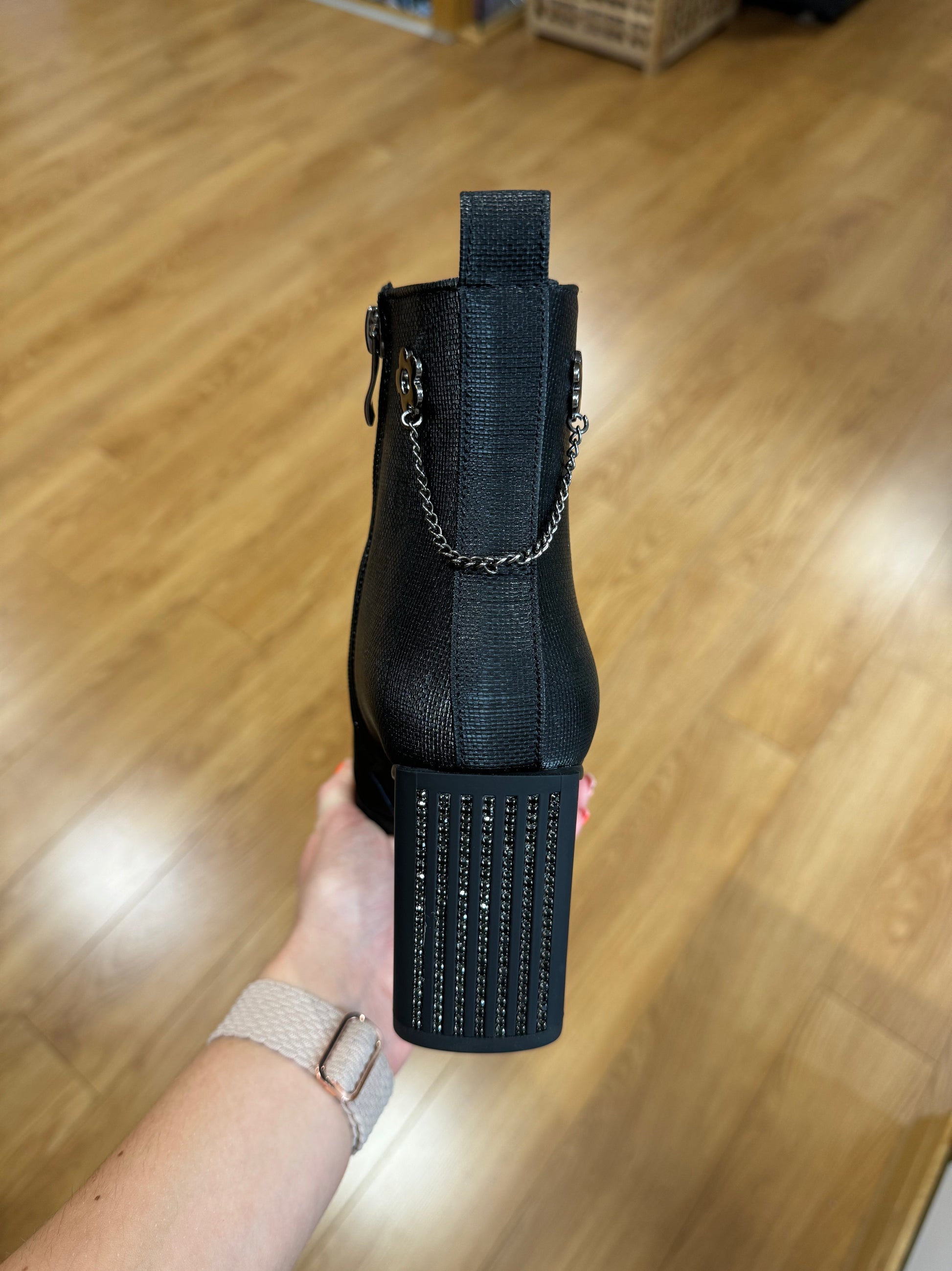 Redz Asymmetric Heeled Boot with Subtle Metallic Finish, Dipped Shaped Front & Diamanté/Chained Heel